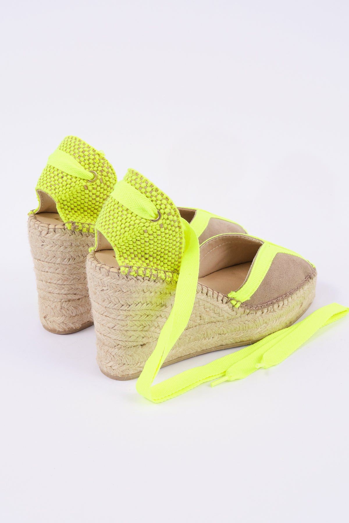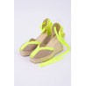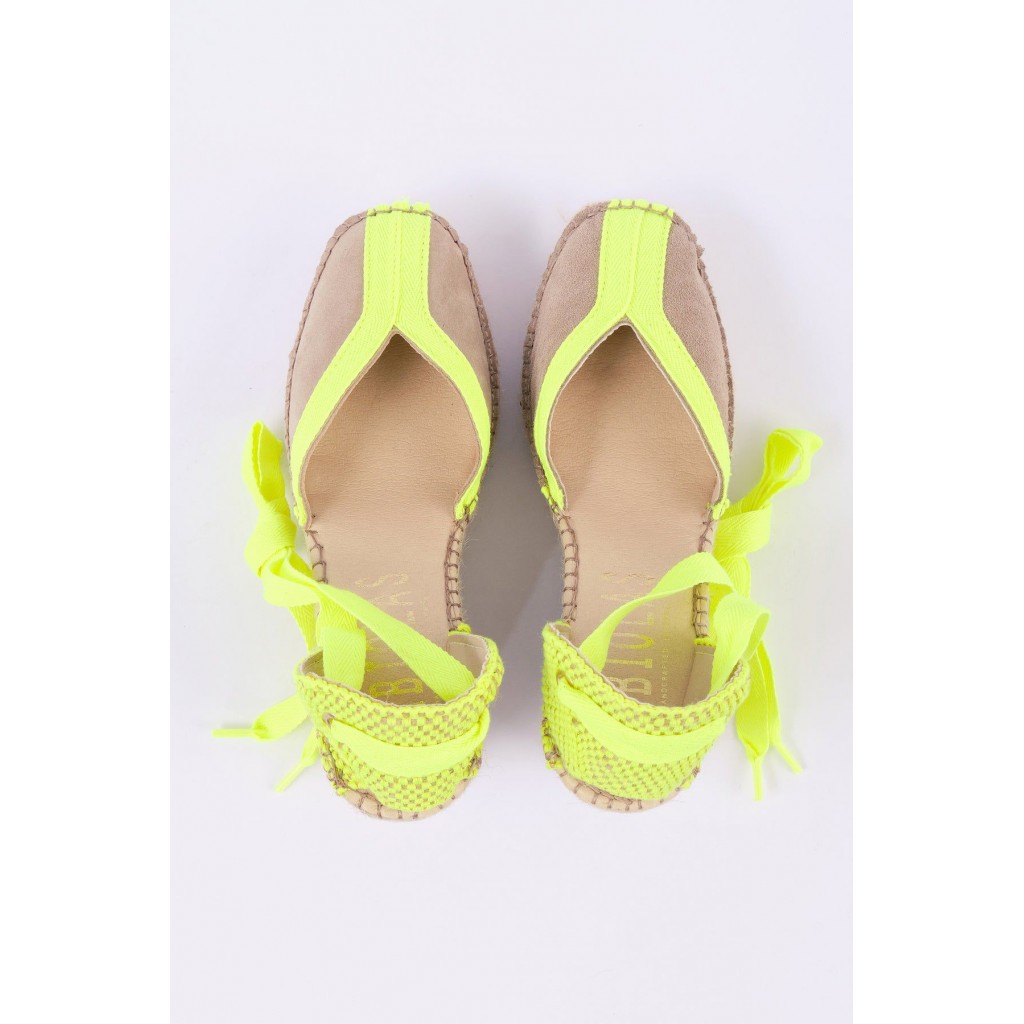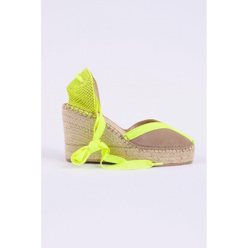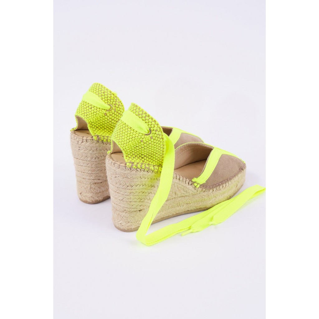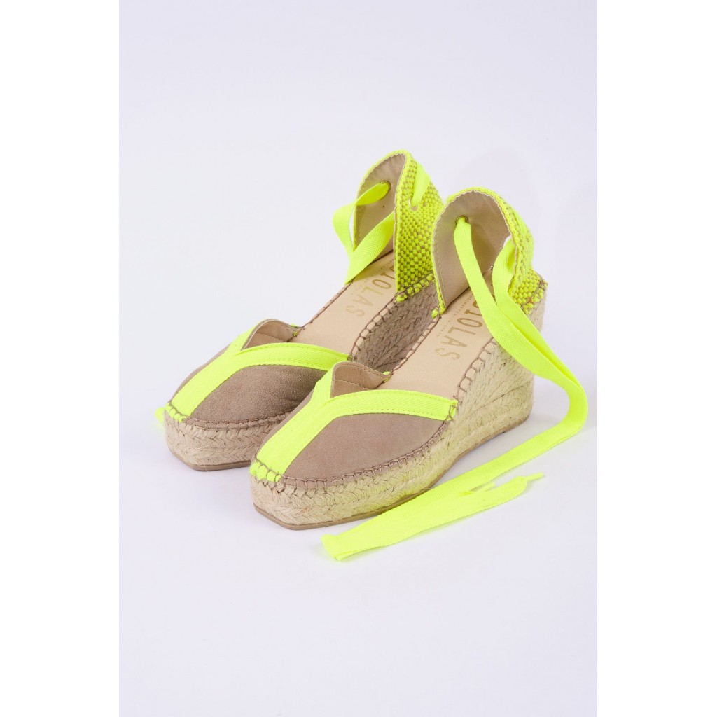 Alpargata cerrada de cuña alta con puntera cuadrada elaborada en vitelo piedra. Pala vitelo con escote en forma de corazón y cinta amarilla en forma de Y. Talonera amarilla fosforita con ojetes y cintas amarillas fosforitas para atar al tobillo. Piso de yute natural de 10 cm, de los cuales 6.5 cm corresponden a la cuña y 3.5 cm a la plataforma. Diseñado, fabricado y cosido todo en España, cómodas, con suela antideslizante y piso relleno de corcho, para un peso más ligero.