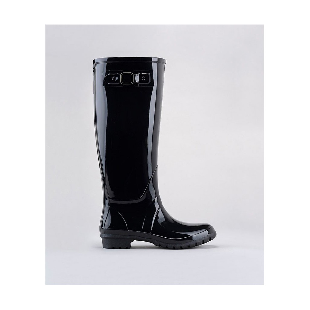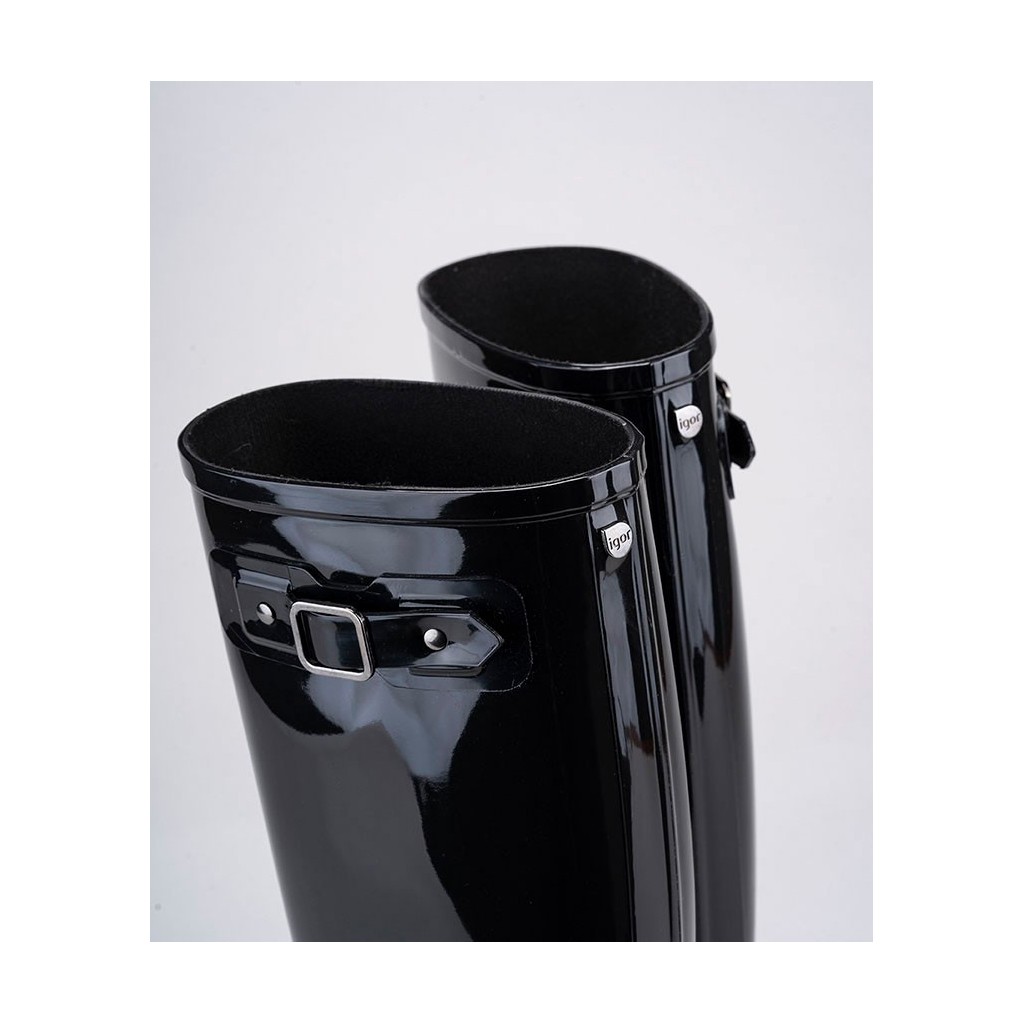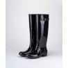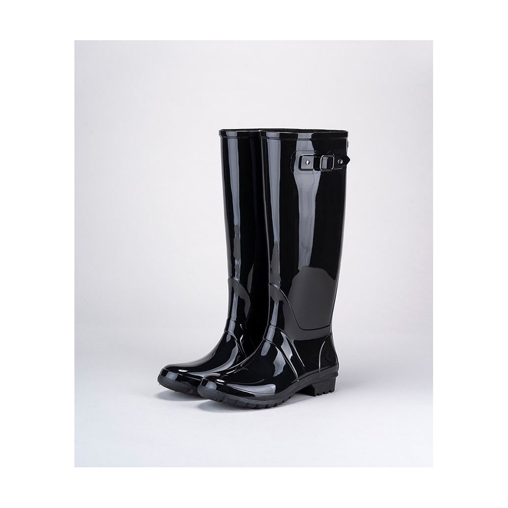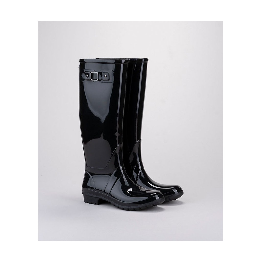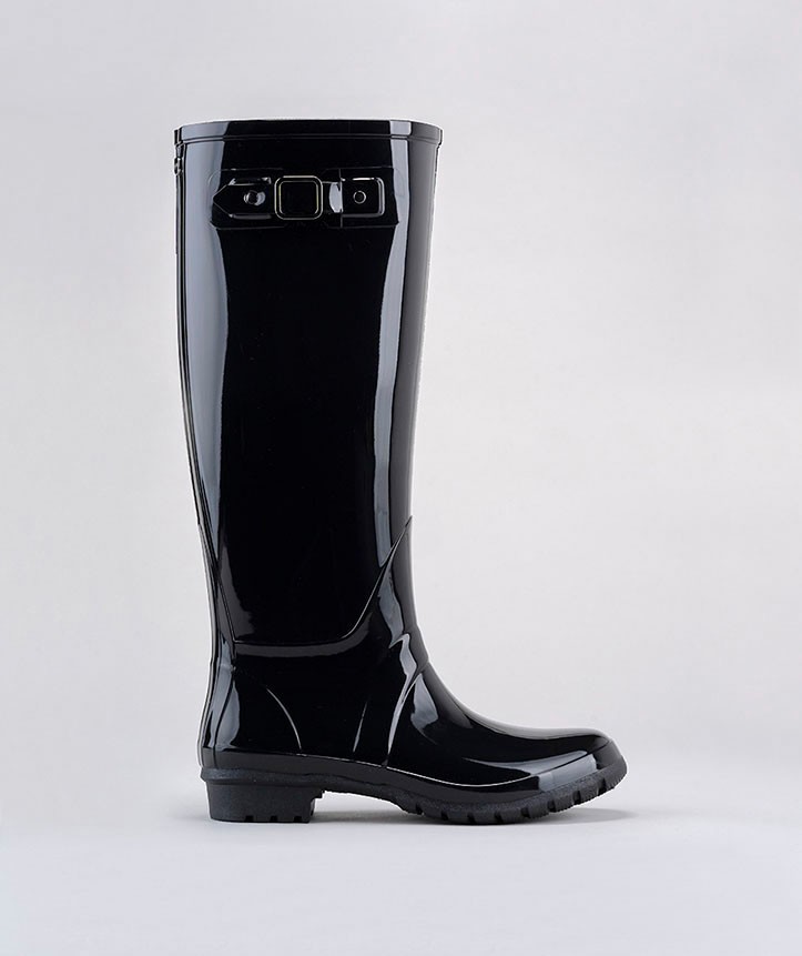 Botas de agua de caña alta con acabado brillo, plantilla confort extraíble, forro textil y detalle de hebilla en el lateral.