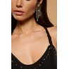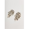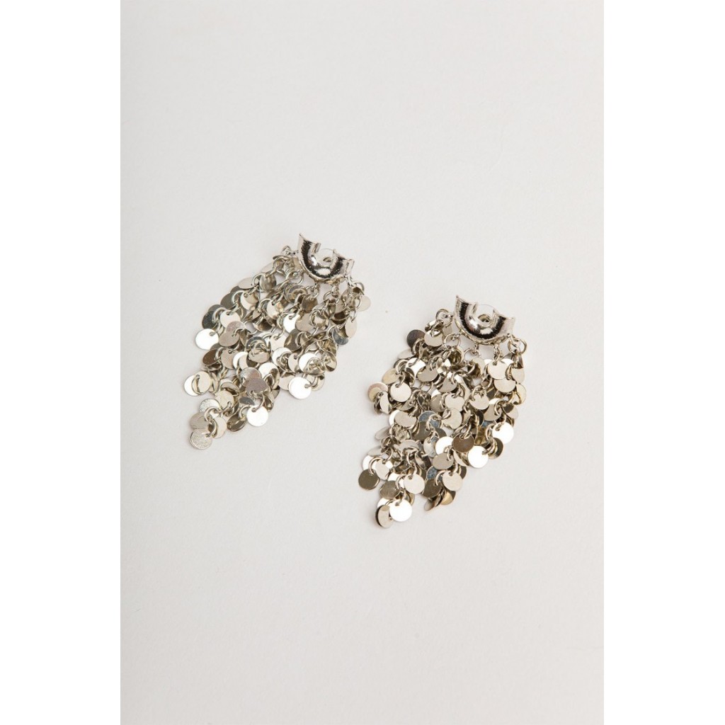 Pendientes con pieza superior semicircular. Detalle de cascada de cadenas con múltiples discos circulares metálicos. Color plateado.