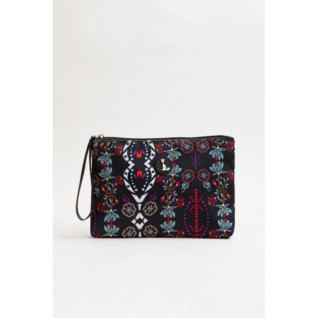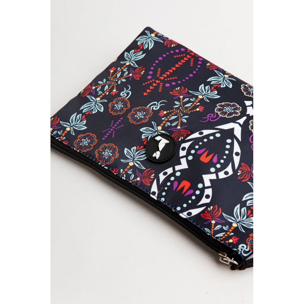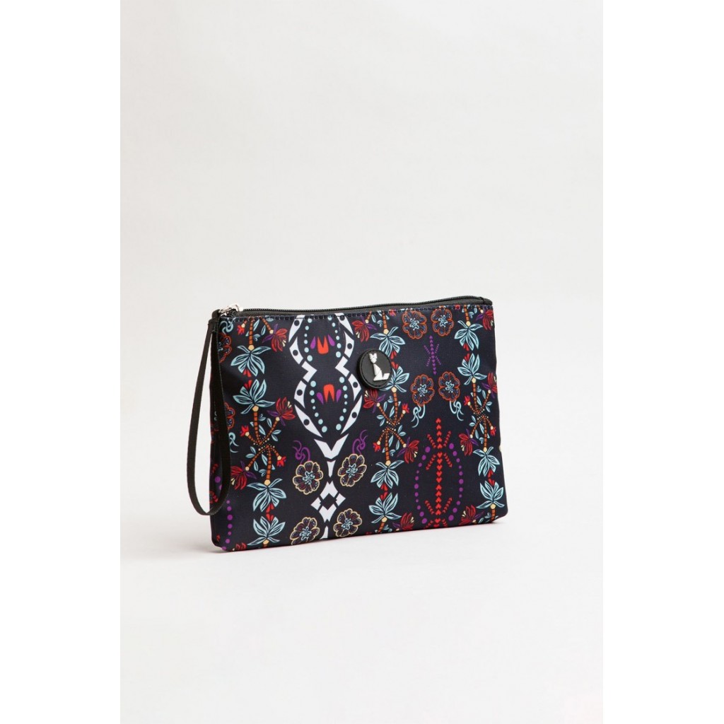 Neceser con cierre de cremallera superior y asa de mano lateral. Detalle de parche circular con logo en el frontal. Estampado boho multicolor sobre fondo negro.