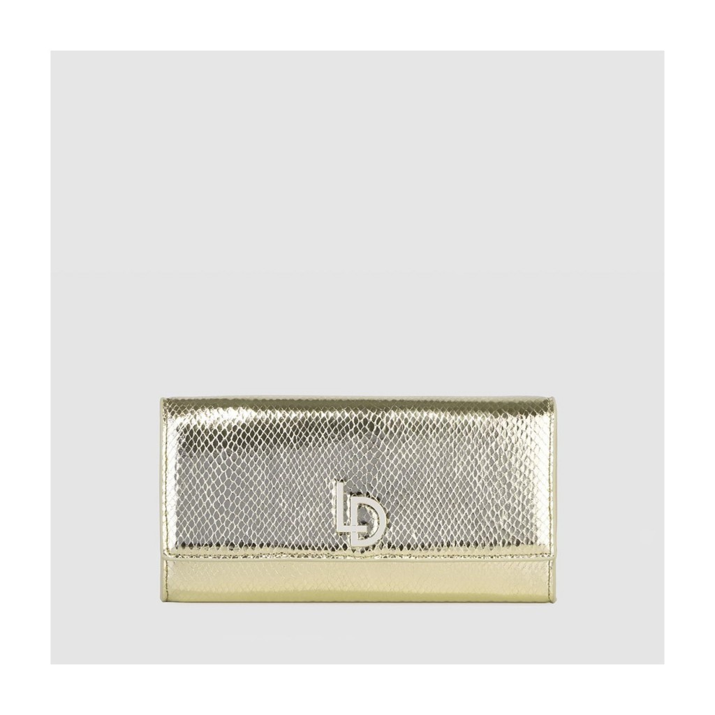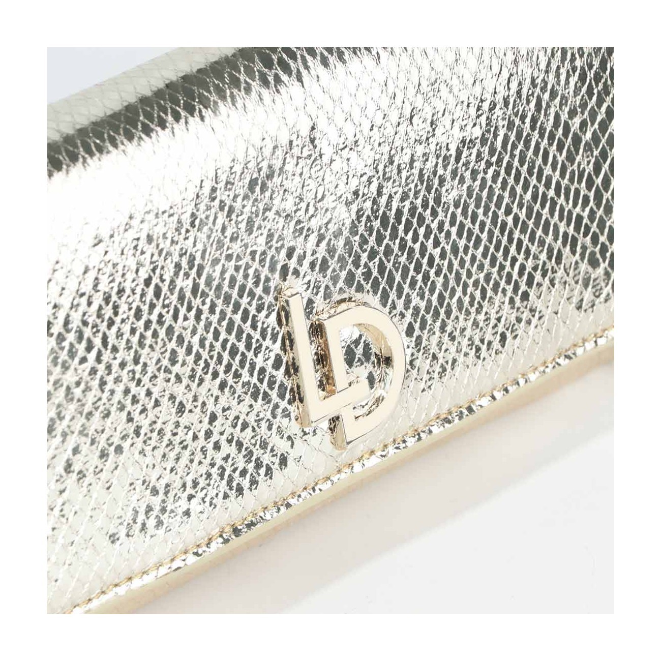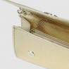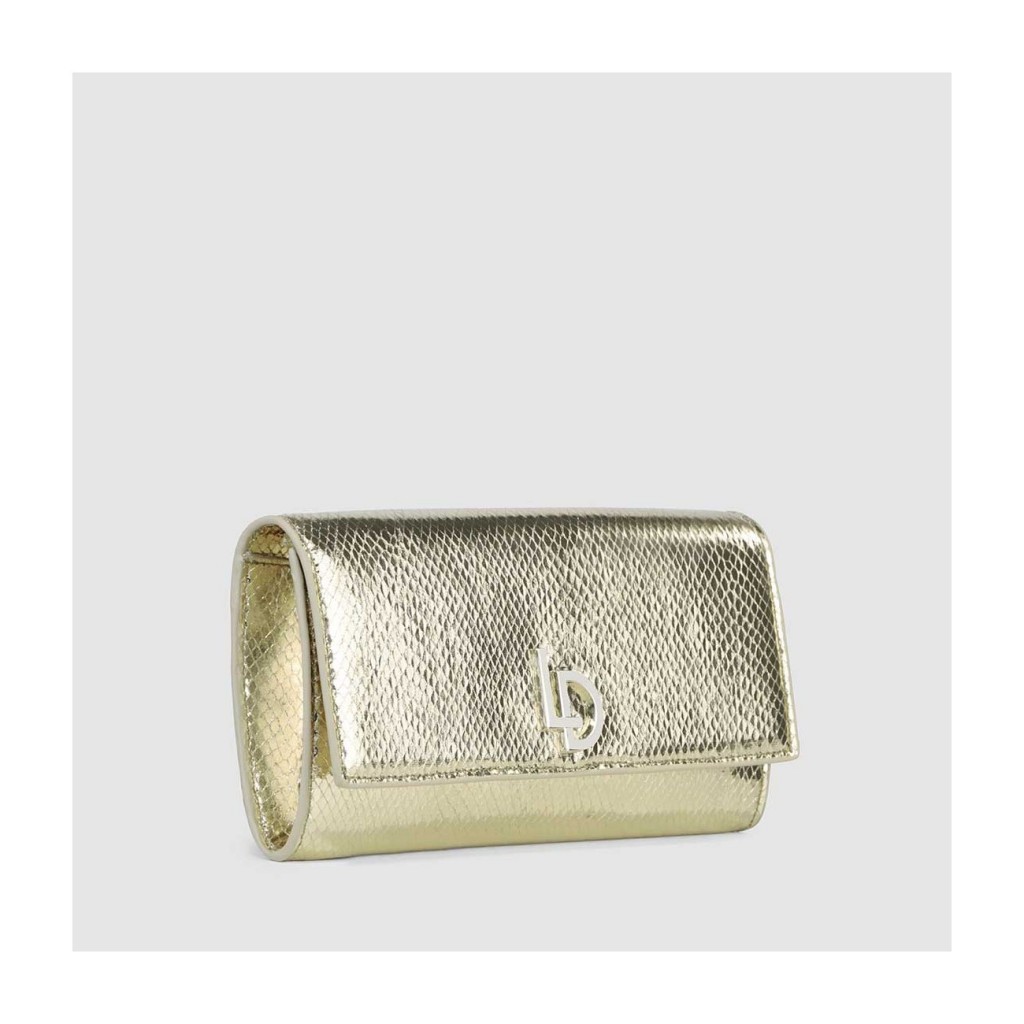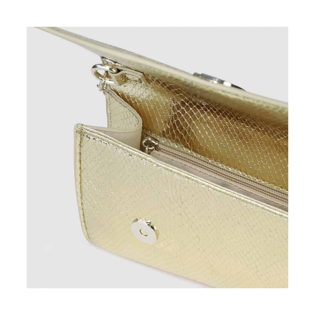 Bolso tipo sobre modelo VOGUE de LODI, acabado en efecto piel serpiente de color dorado. Con logo distintivo de la marca, el interior forrado y el cierre mediante botón magnético. Incluye cadena interior. Un accesorio minimalista que resalta tu elegancia en ocasiones especiales. Medidas de Alto x Ancho x Fondo 13 x 24.5 x 4 cm.