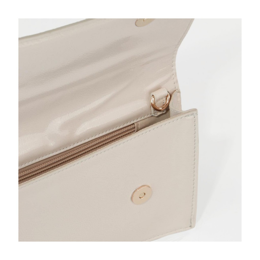 Bolso de mano estilo sobre de LODI efecto charol color nude. Bolso de mano estilo sobre modelo ASTRID de LODI efecto charol color nude. El modelo incluye un asa multiposición extraíble para llevarlo cruzado. Detalle metálico en color dorado con logo de la firma. Interior forrado y el cierre metálico. Alto 15.5 x Ancho 27 x Fondo 5 cm.