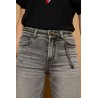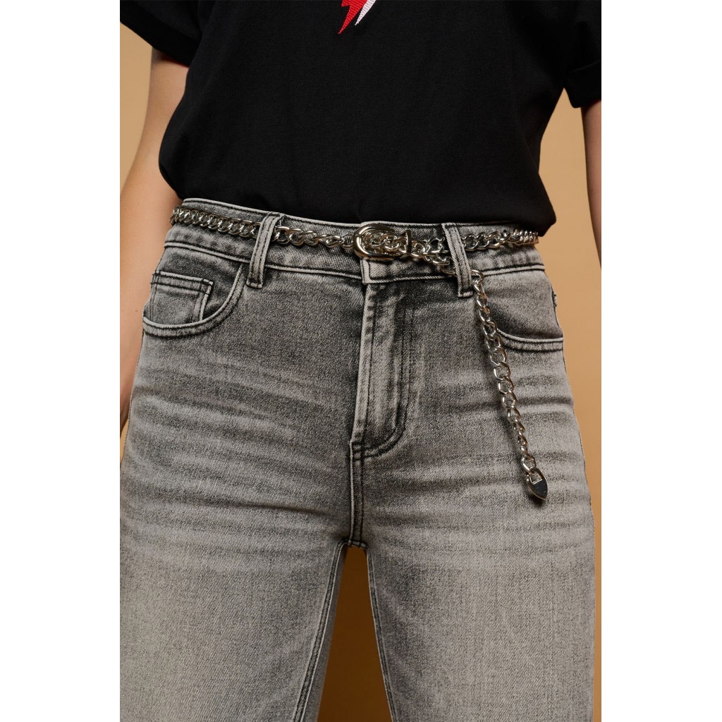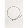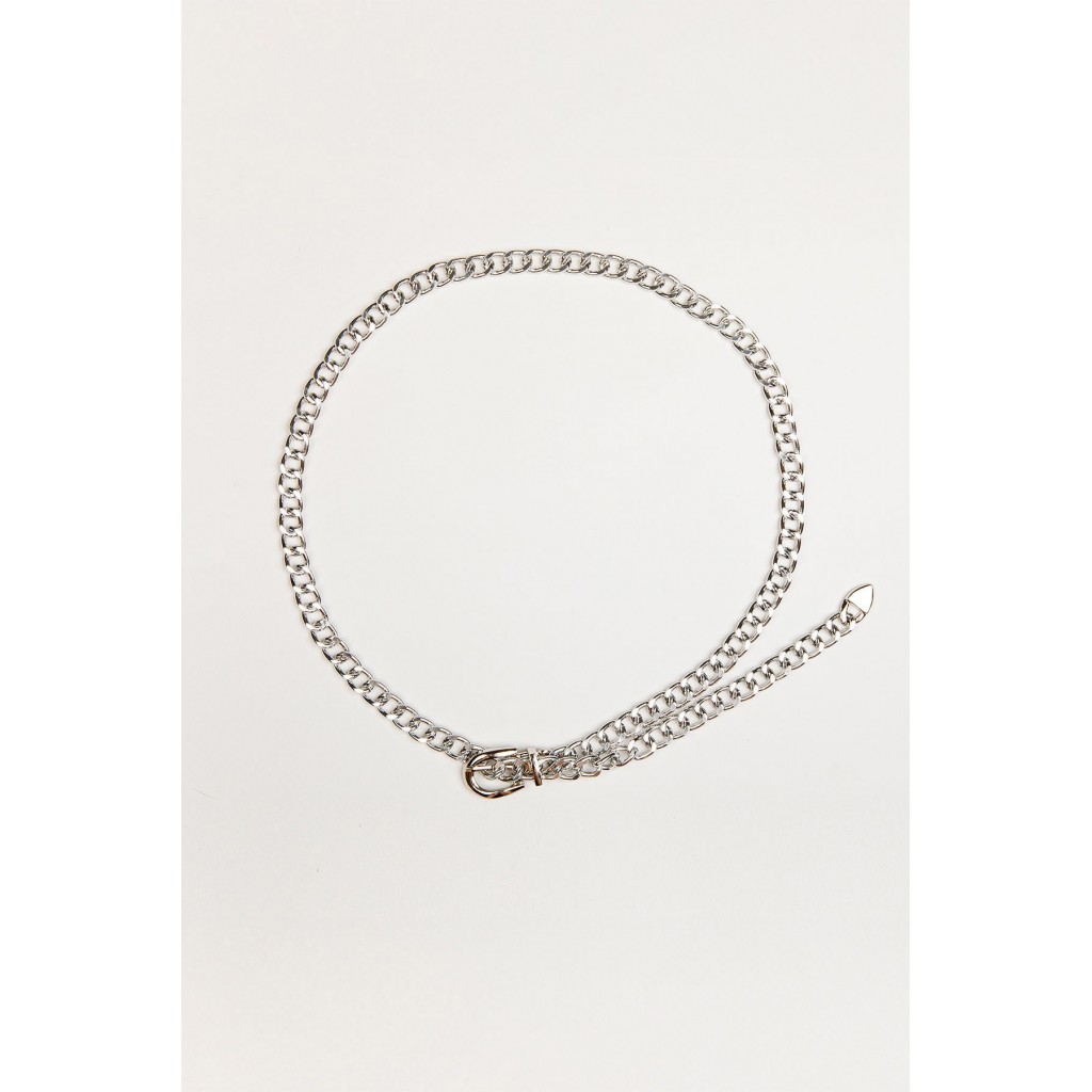 Cinturón de cadena con hebilla metálica. Detalle de cadena ajustable con puntera metálica en el extremo. Color plateado.