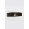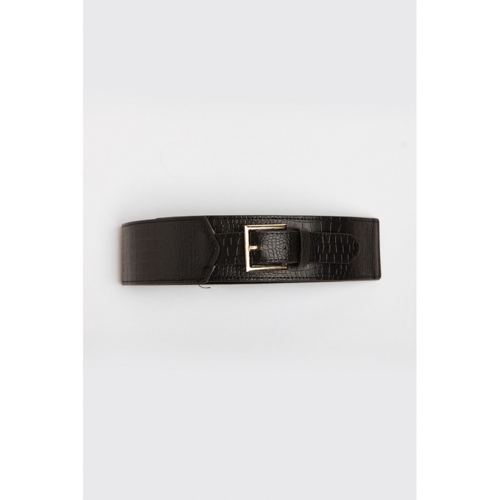 Cinturón elástico con frontal de polipiel. Detalle de hebillas metálicas.