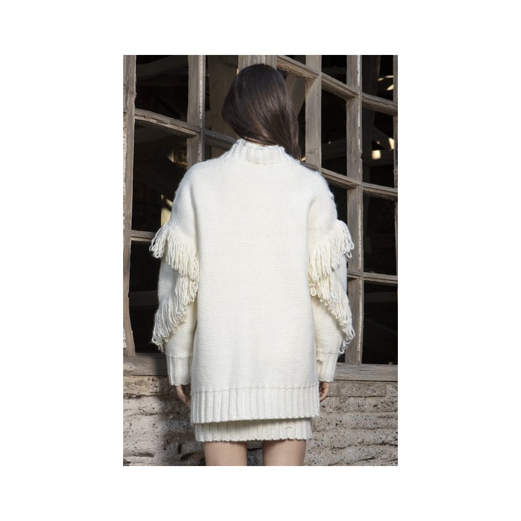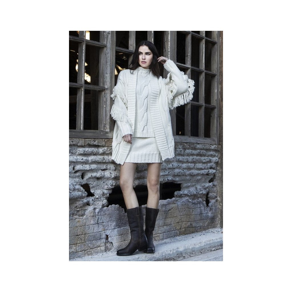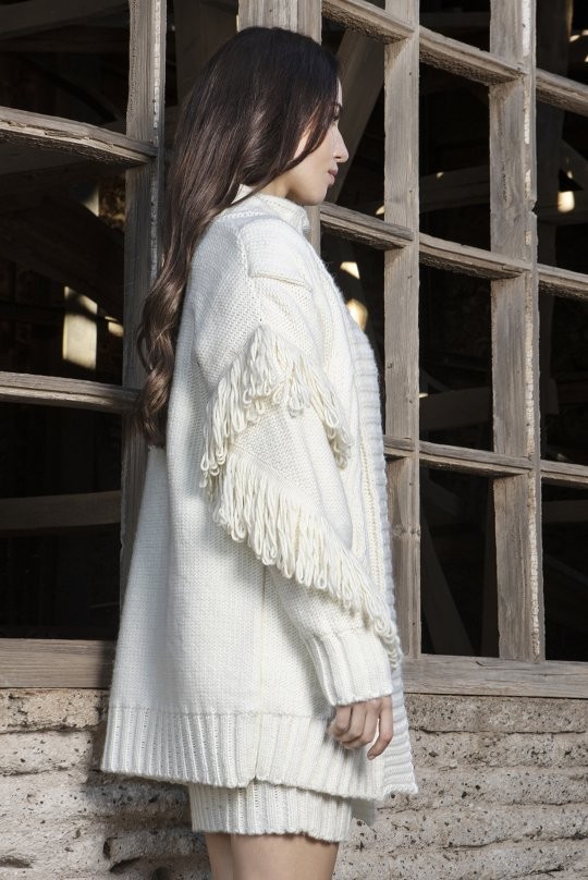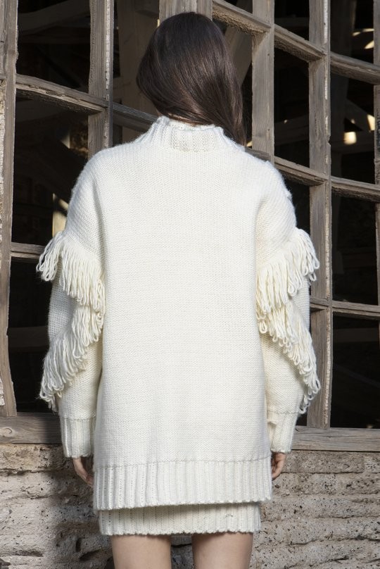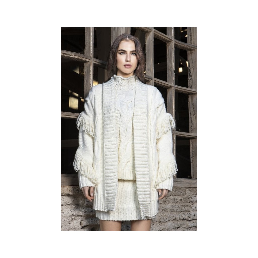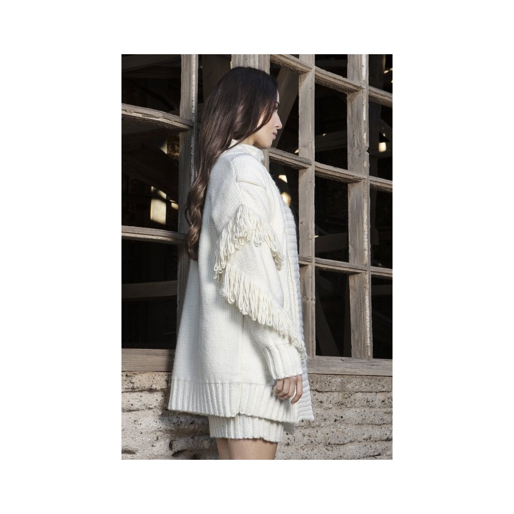 Descubre el cárdigan de punto grueso con flecos. Con mangas largas, ribetes acanalados y ajuste cómodo. Combínalo con su jersey de flecos y pantalón a juego para un look completo y acogedor. Una elección que no debe faltar en ningún armario de invierno.