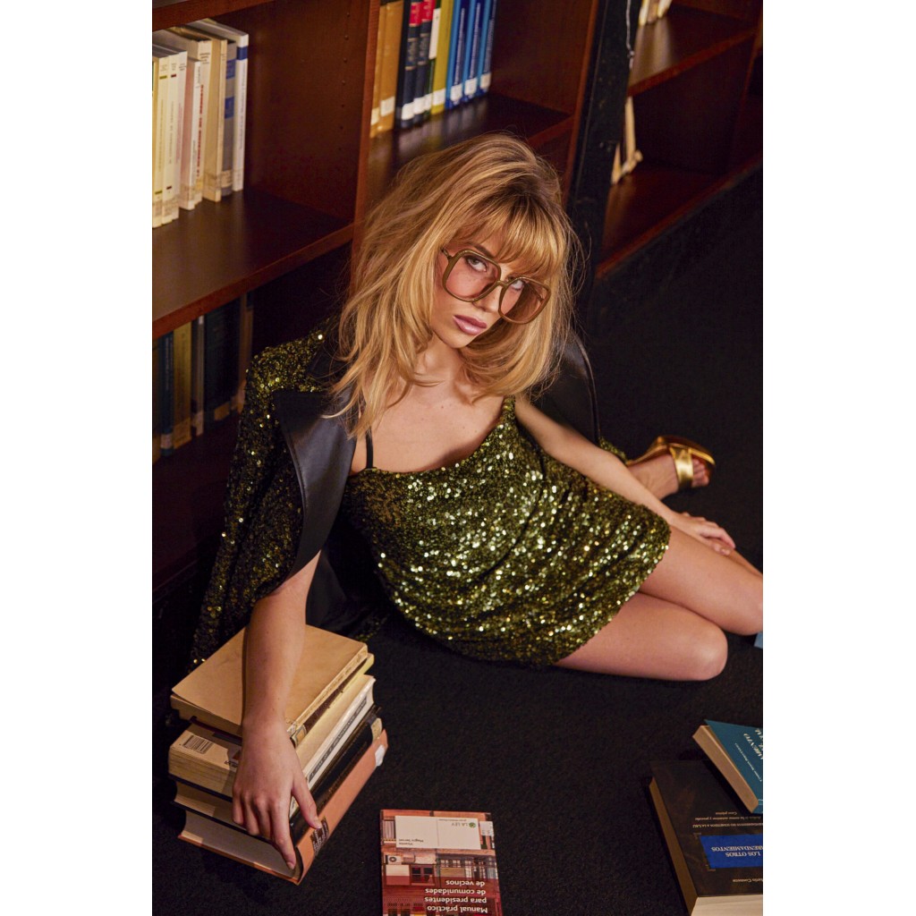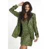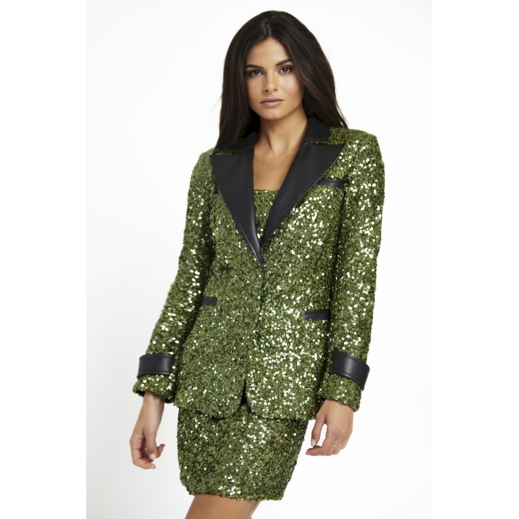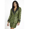 Lucy Liu Blazer de pallet verde con contrastes de polipiel negra; solapa, bolsillos delanteros en vivo y trabilla en mangas.