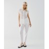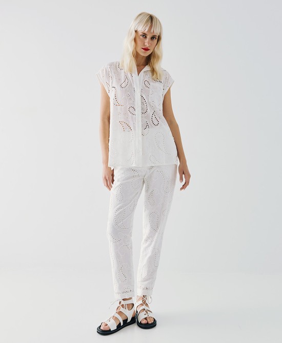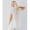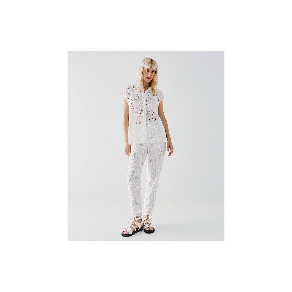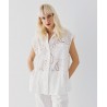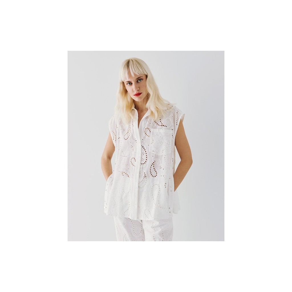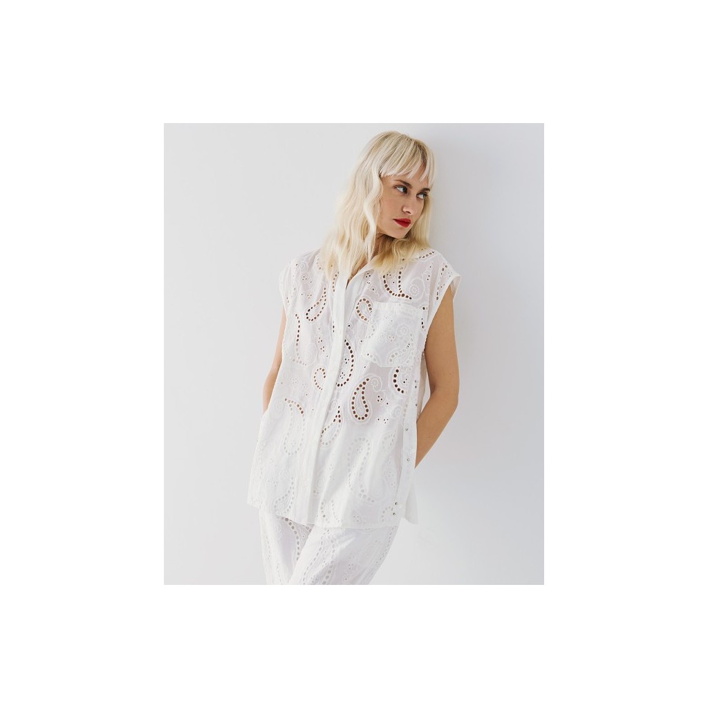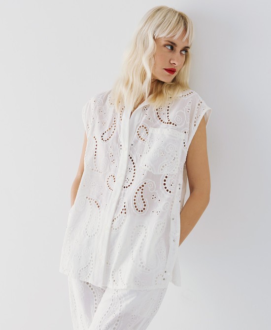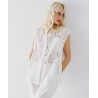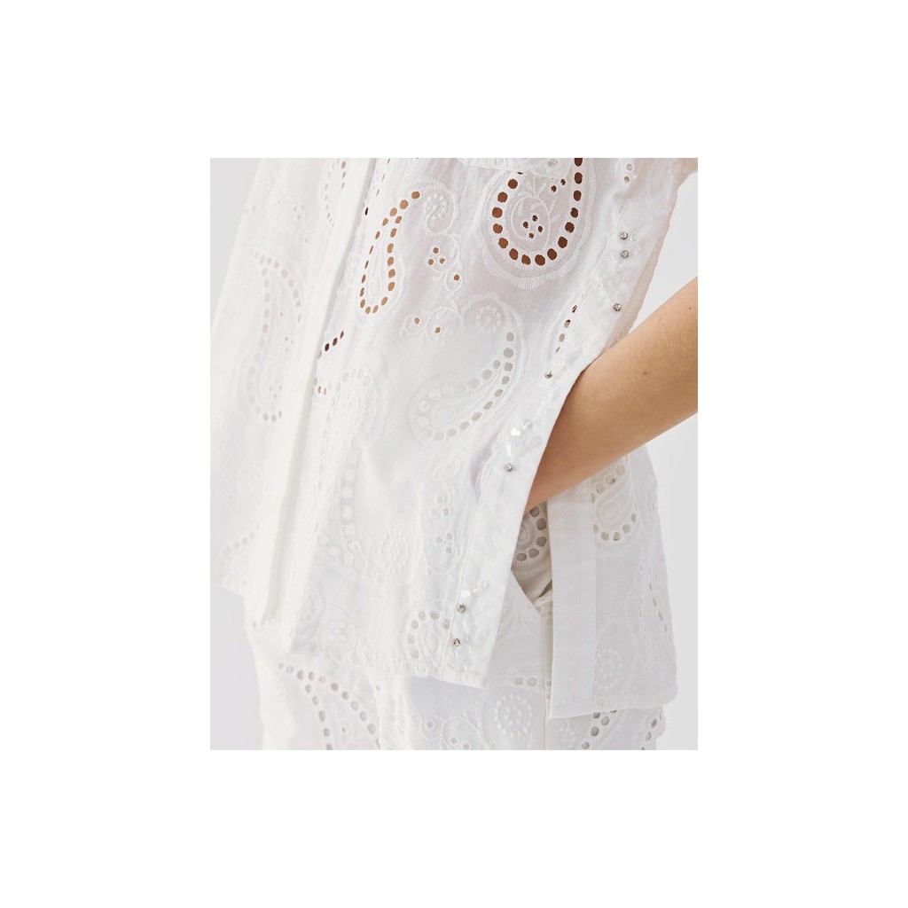Camisa sin mangas con diseño bordado y bolsillo delantero. Presenta aberturas laterales adornadas con pedrería y lentejuelas. Combínala con los pantalones a juego de nuestra colección para lucir elegantes looks veraniegos.