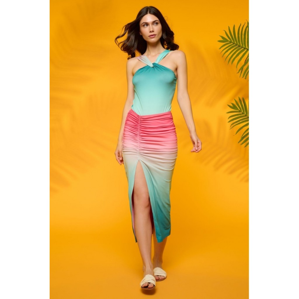 Falda de tiro alto con efecto drapeado y fruncido y abertura laterales. Forro interior.