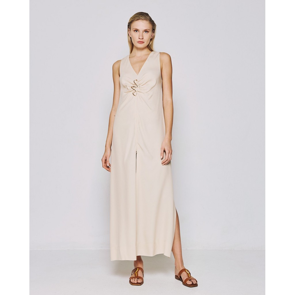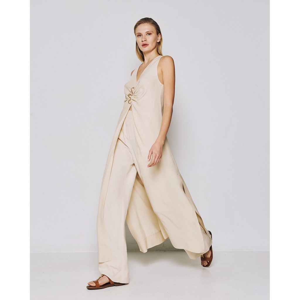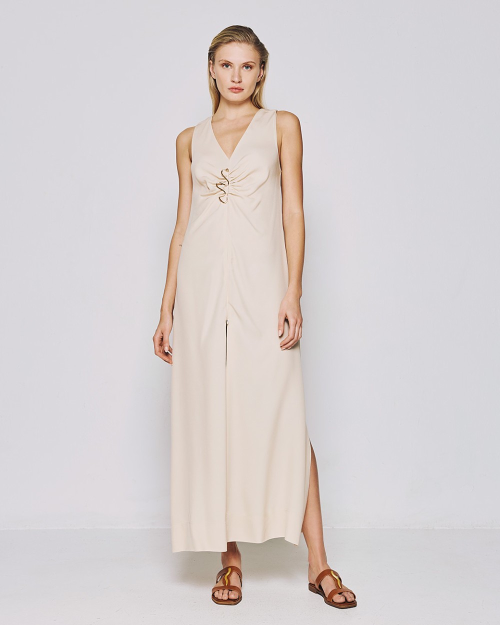 Vestido largo sin mangas con frunces y detalle metalizado en la parte delantera. Presenta aberturas laterales y cierre de cremallera ajustable en la parte delantera. Llévalo solo o combínalo con pantalones anchos para lucir un estilo veraniego.