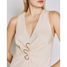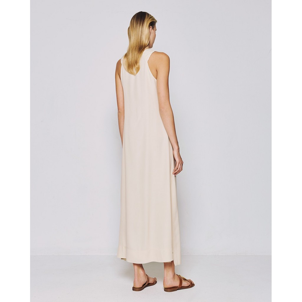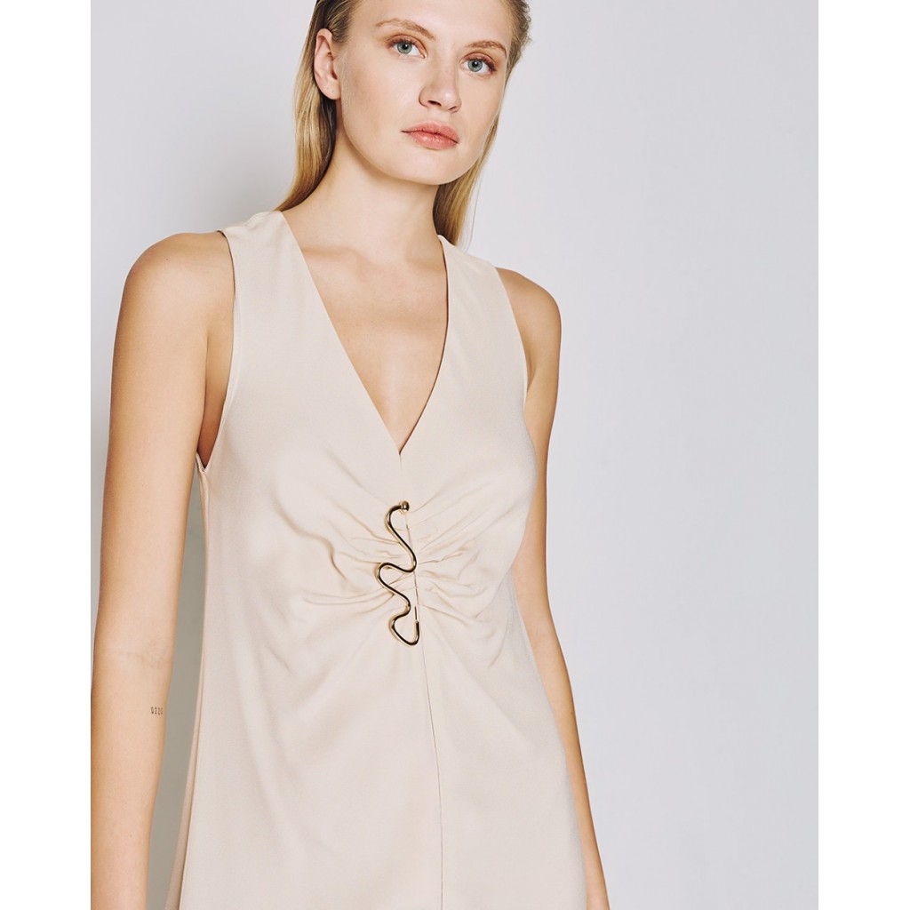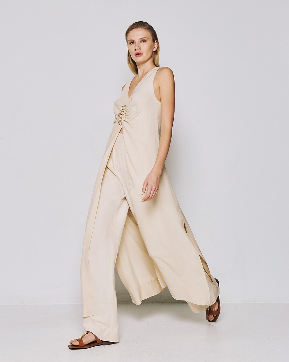 Vestido largo sin mangas con frunces y detalle metalizado en la parte delantera. Presenta aberturas laterales y cierre de cremallera ajustable en la parte delantera. Llévalo solo o combínalo con pantalones anchos para lucir un estilo veraniego.