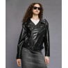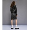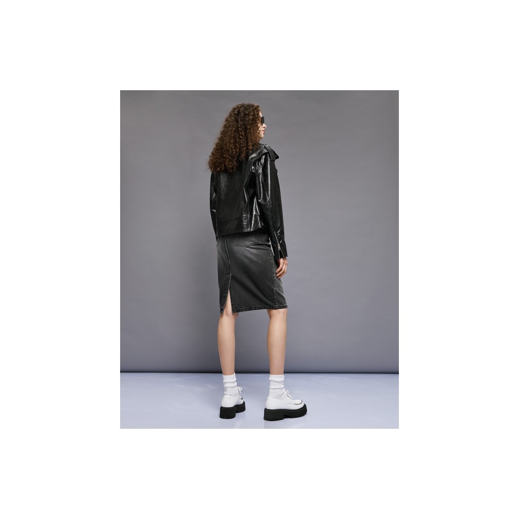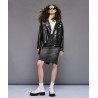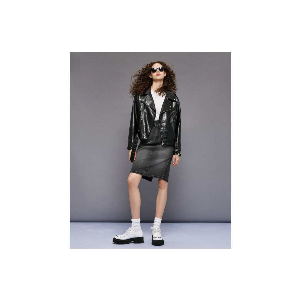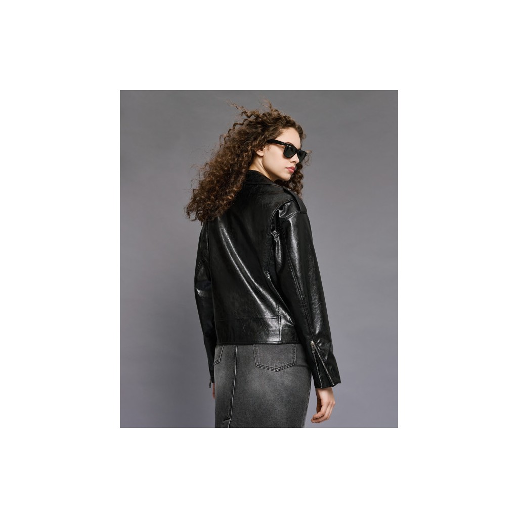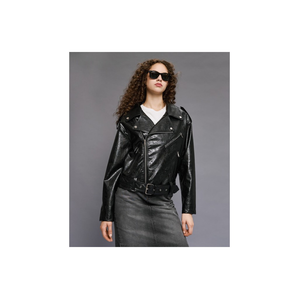 Chaqueta corta de piel sintética con cuello, hombreras y bolsillos laterales con cremallera. Cuenta con trabillas, cinturón de piel sintética desmontable con hebilla y cierre de cremallera frontal. Una opción atemporal para looks elegantes.