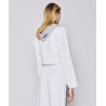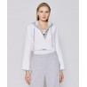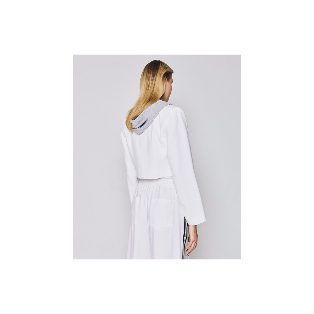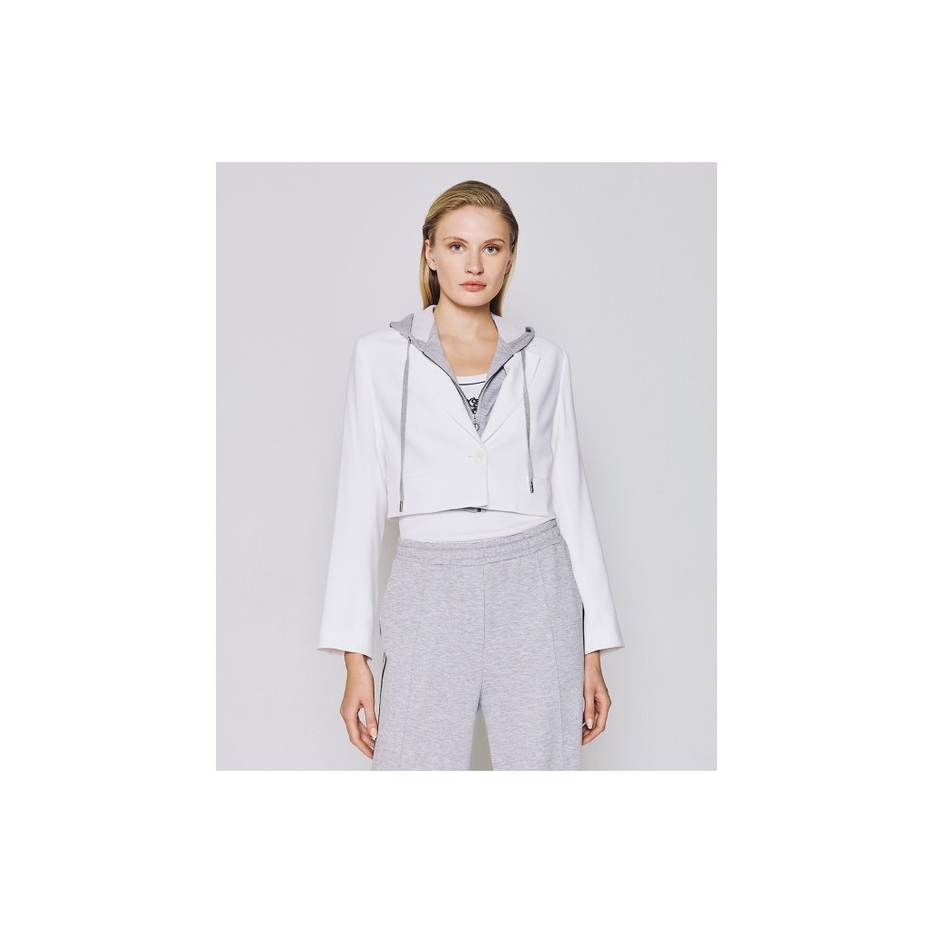 Blazer corto con cuello de solapa y cierre de botones frontal. Cuenta con una capucha desmontable con cordones y cremallera para ajustarlo a tu estilo. Combínalo con los pantalones a juego de nuestra colección para lucir un estilo elegante.