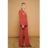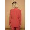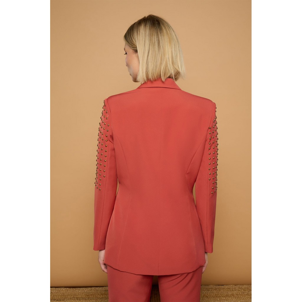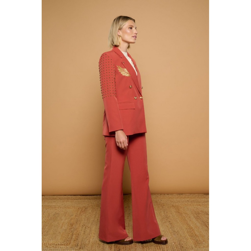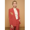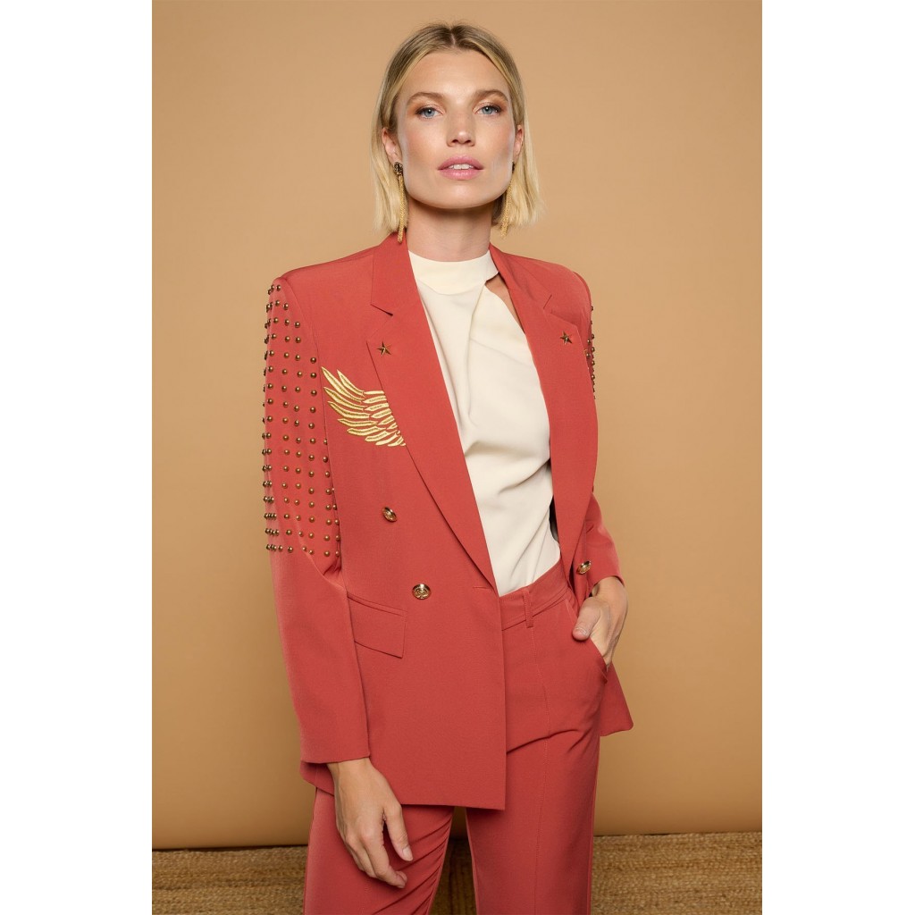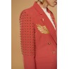 Chaqueta americana o blazer cruzada en coral. Cuello solapa y manga larga con hombreras. Detalle de alas bordadas en hilo dorado y estrellas sobre las solapas. Detalle de tachuelas esféricas doradas en hombros y laterales. Cierre frontal de doble botonadura con botones metálicos dorados