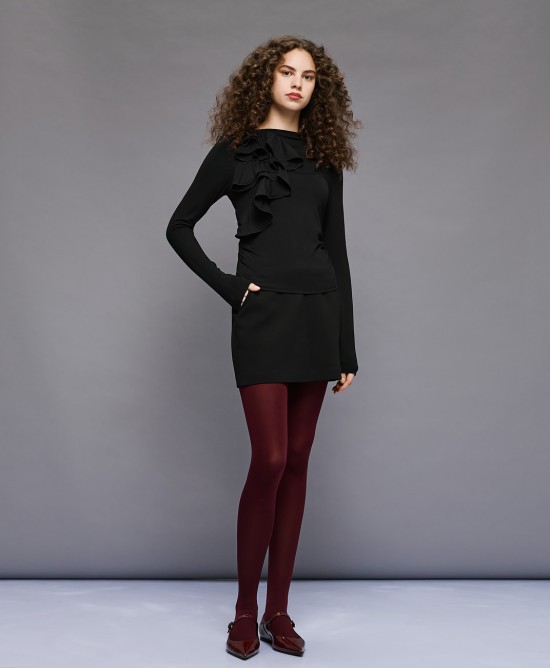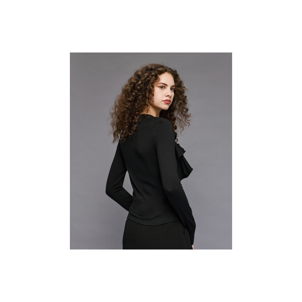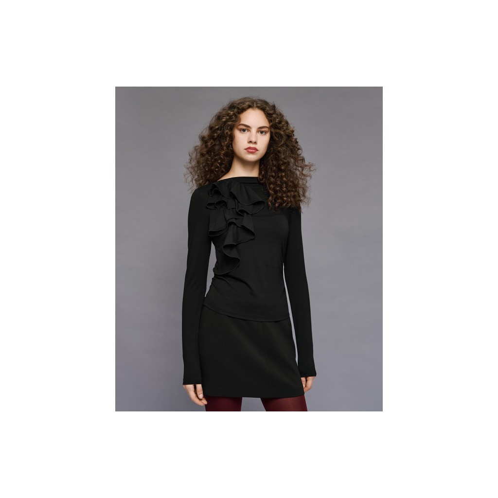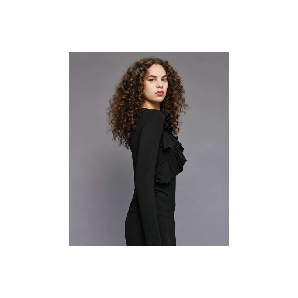 Blusa ajustada de manga larga con fruncido lateral y volantes decorativos en la parte delantera. Ideal para looks elegantes y llamativos.