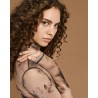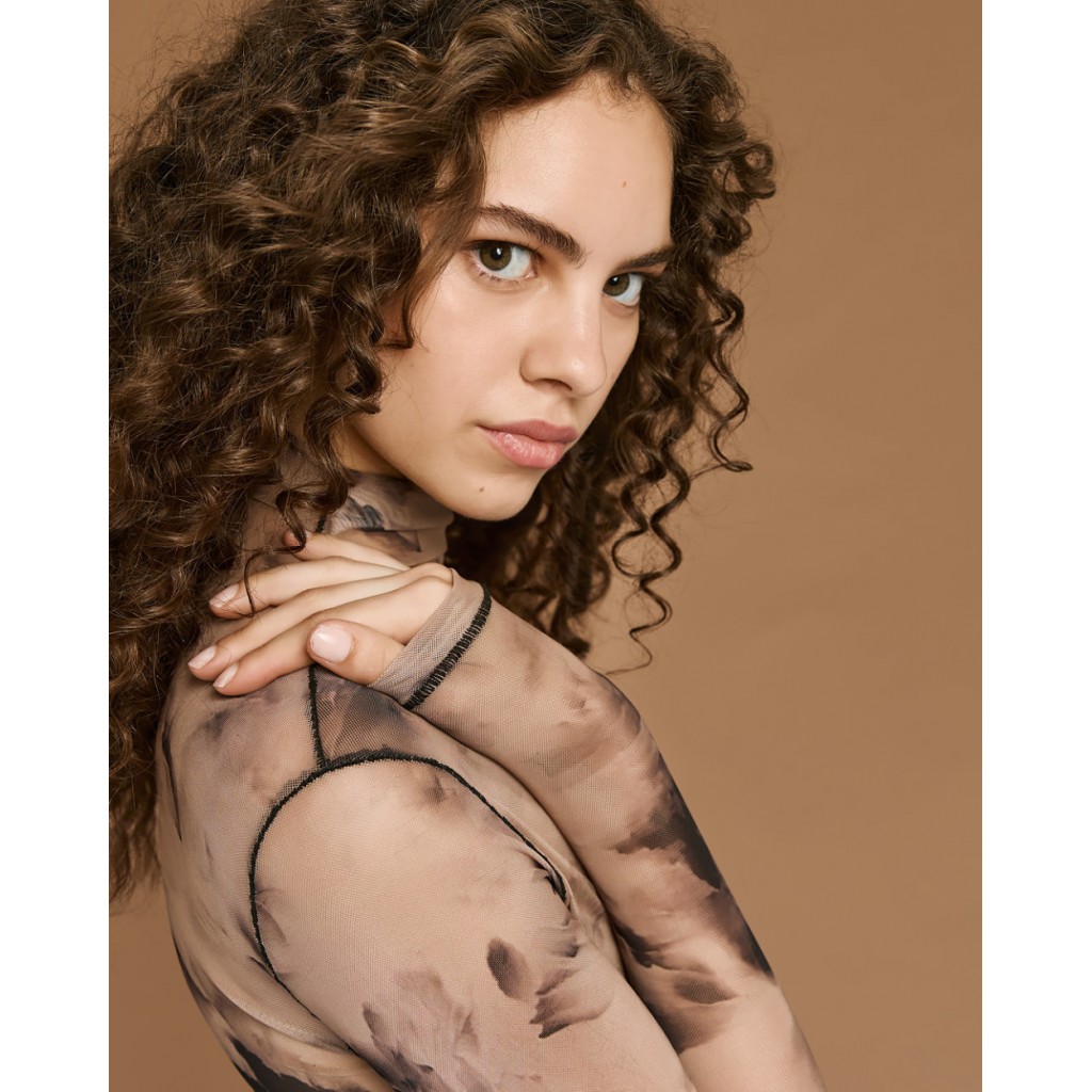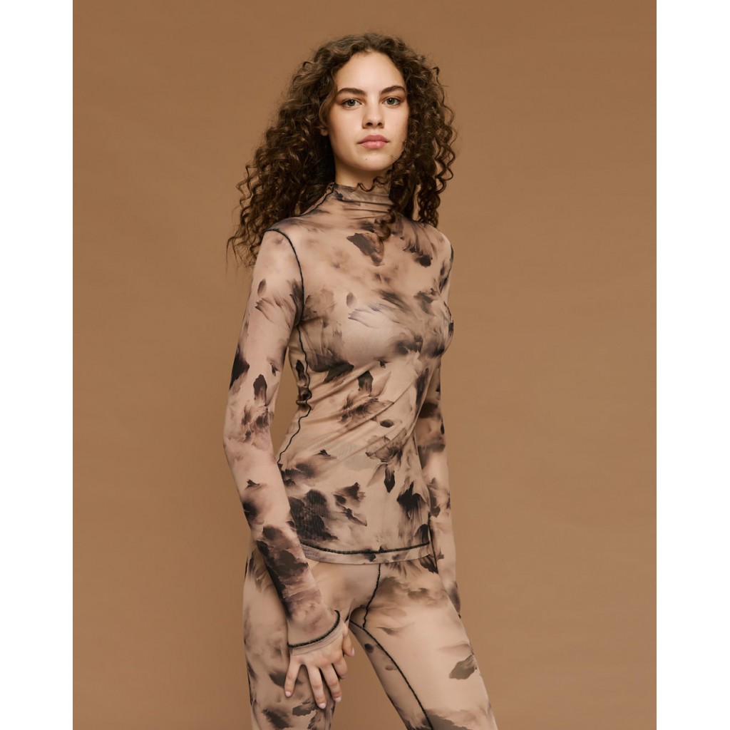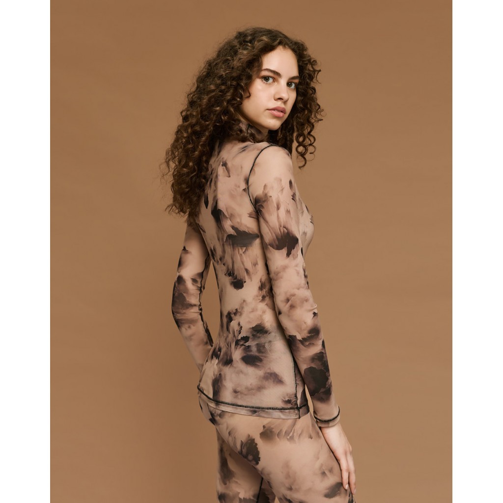 Blusa ajustada de manga larga de tul estampado con escote alto. Ideal para looks únicos con capas.