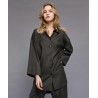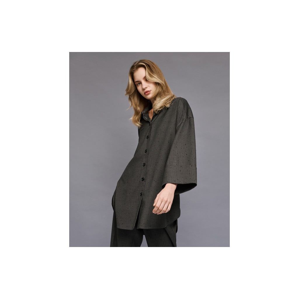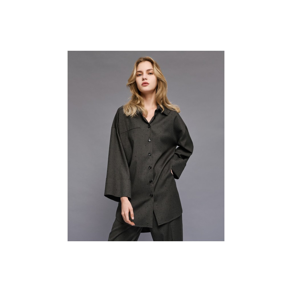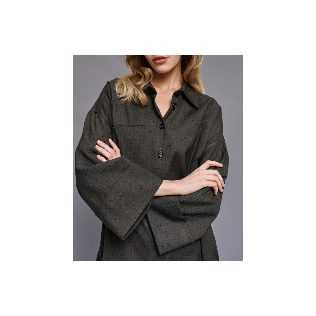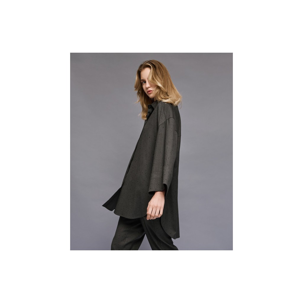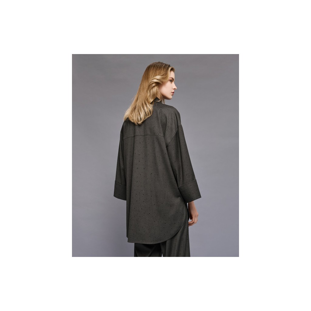 Camisa larga oversize a rayas con detalles de pedrería y cuello. Tiene mangas largas con puños anchos y cierre de botones delantero. Combínala con los pantalones a juego de nuestra colección para lucir un look chic durante todo el día.