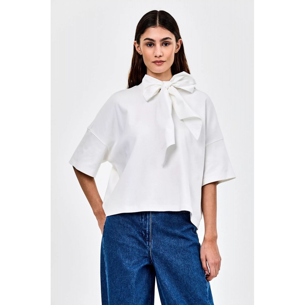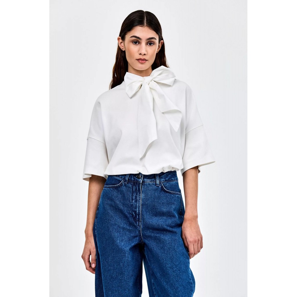 Esta camiseta blanca para mujer se renueva al instante gracias al lazo. Su tejido suave y su ajuste cómodo la hacen perfecta para un look informal y cotidiano. Llévala de forma informal con tus vaqueros favoritos o con pantalones de vestir para un look más elegante.