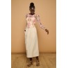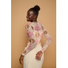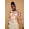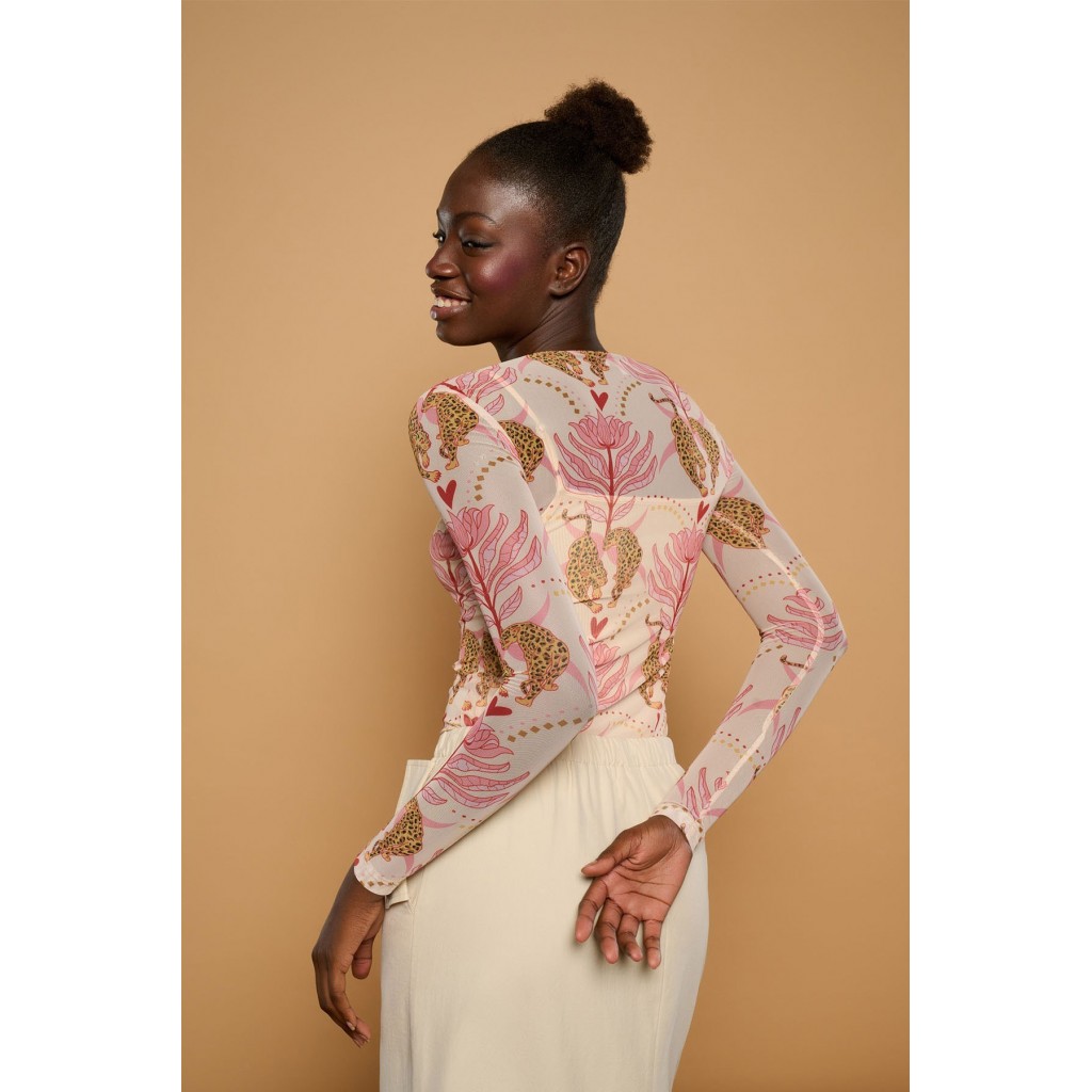 Camiseta de cuello redondo y manga larga. Tejido elástico de tul semitransparente en estampado leo boho. Forro interior de tirantes en tono crema.