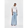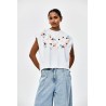 ¡No es una camiseta cualquiera! Esta camiseta blanca de manga corta para mujer es imprescindible para esta primavera y verano. Sus mangas cortas y anchas, junto con una silueta que realza los hombros, se combinan con lentejuelas de colores como adorno.