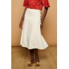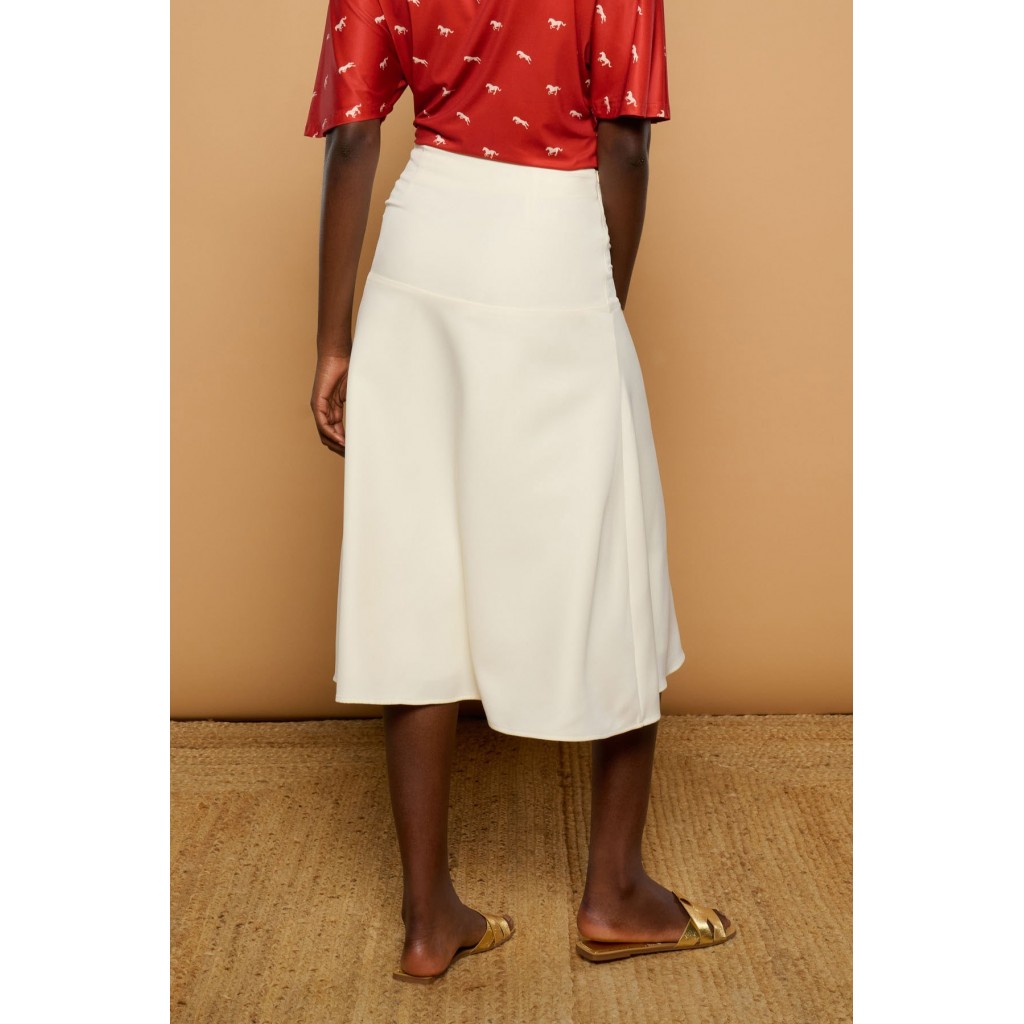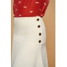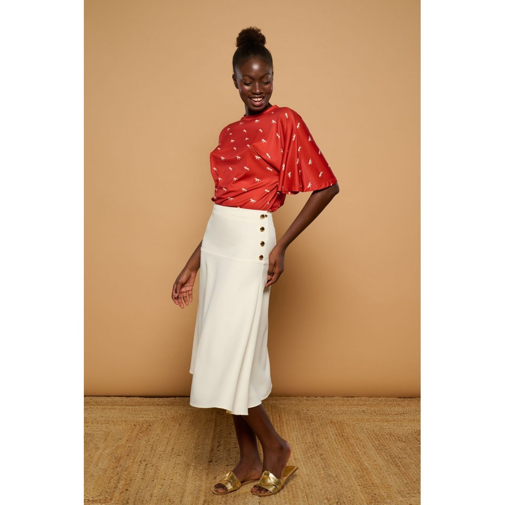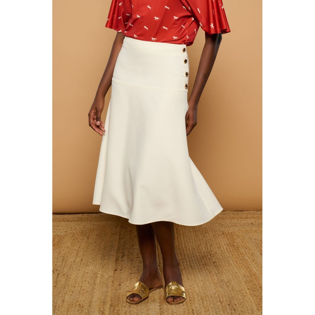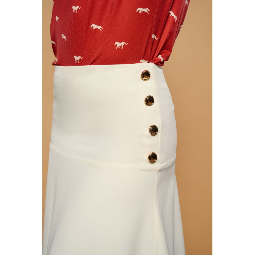 Falda midi de tiro alto y silueta evasé. Detalle de botones dorados metálicos. Cierre con cremallera lateral. Ajustada en cintura.