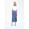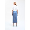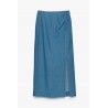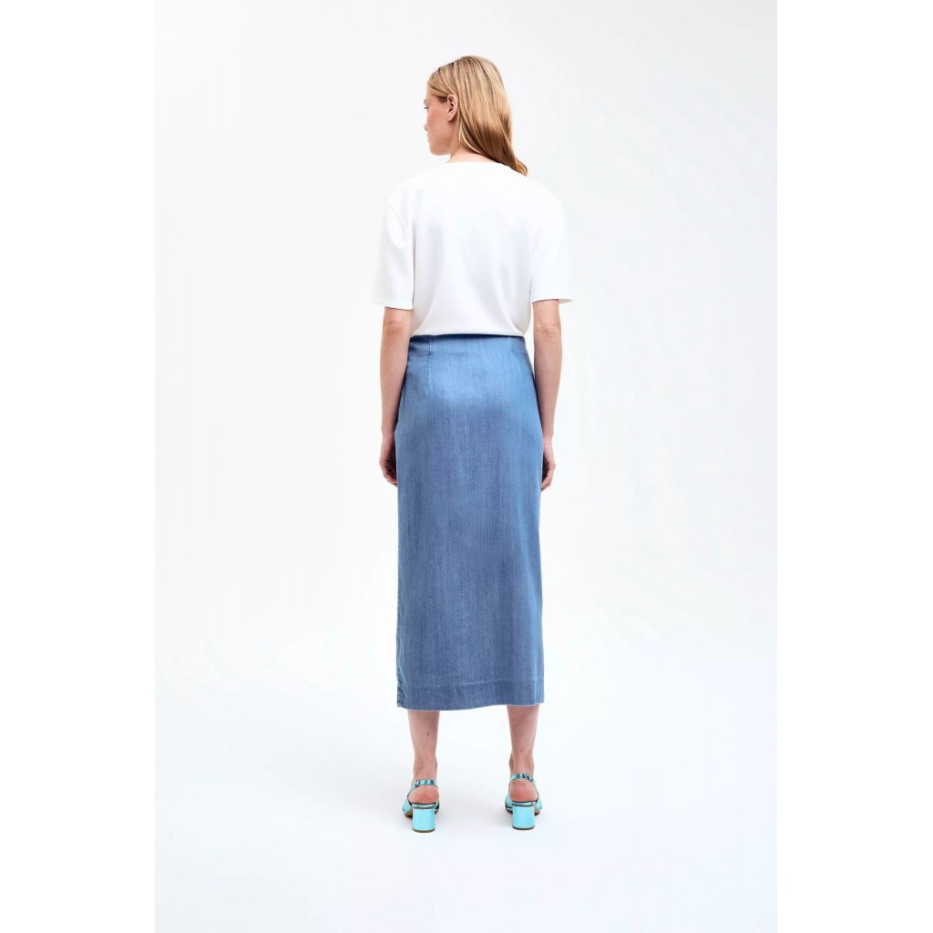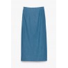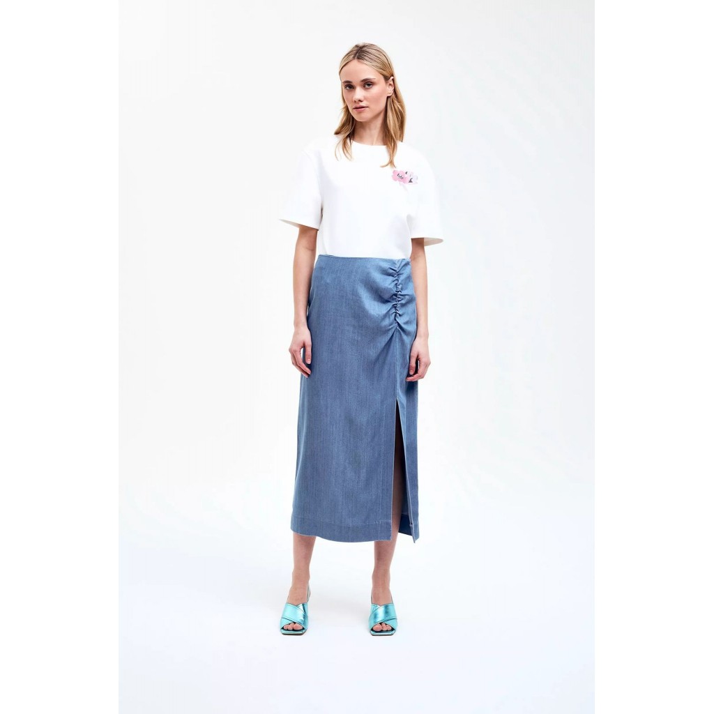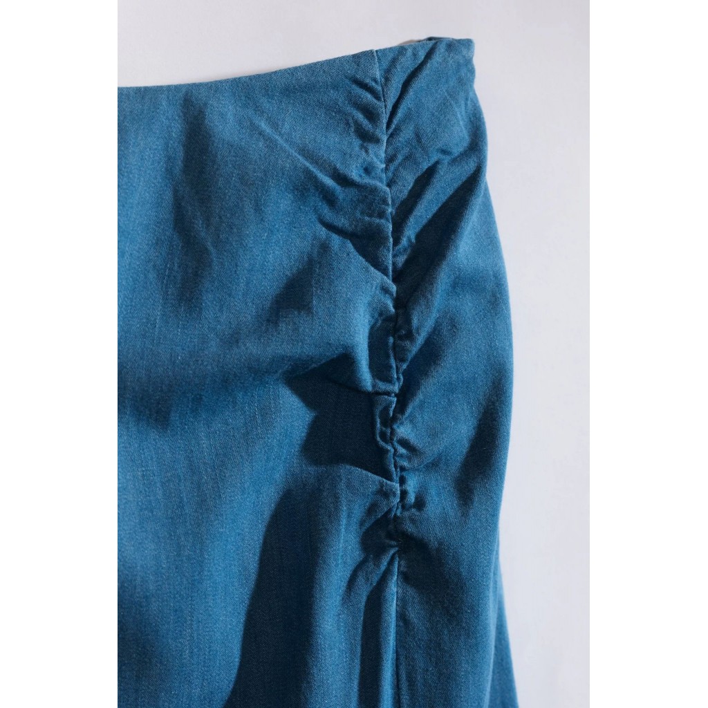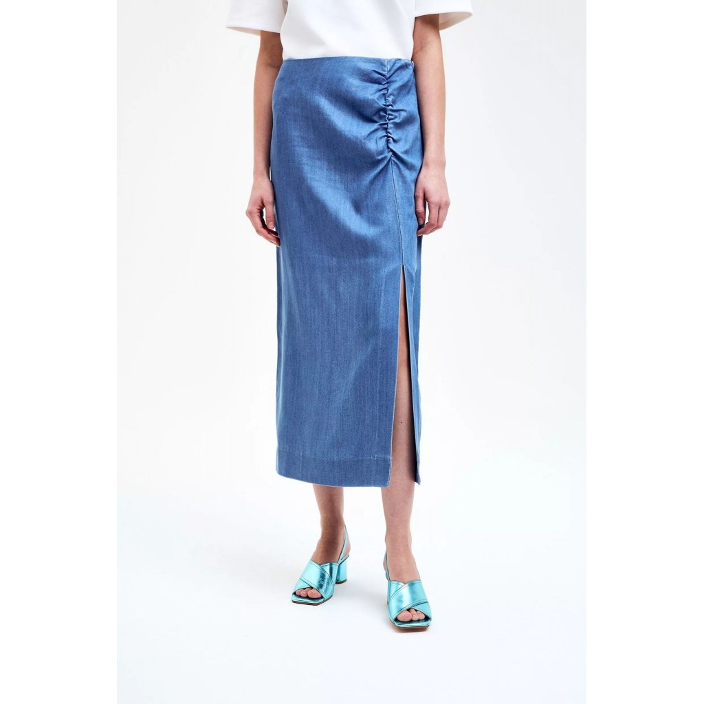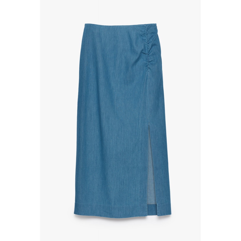 ¡Esta falda midi no es una falda vaquera cualquiera! El detalle fruncido en la cadera y la abertura alta hacen que esta falda vaquera de mujer luzca siempre elegante. Completa tu look con una camiseta, un top o tu blusa favorita. Blazer a juego disponible.