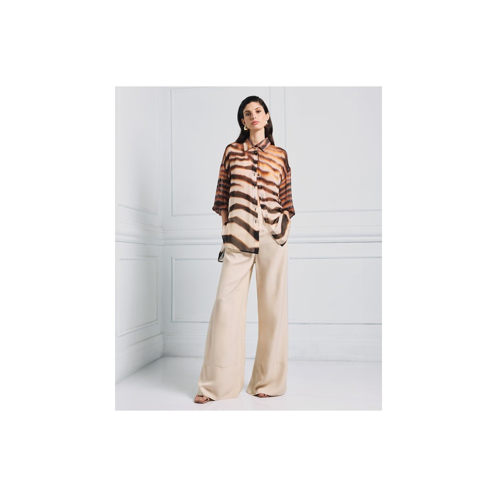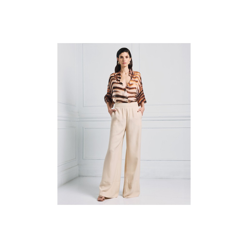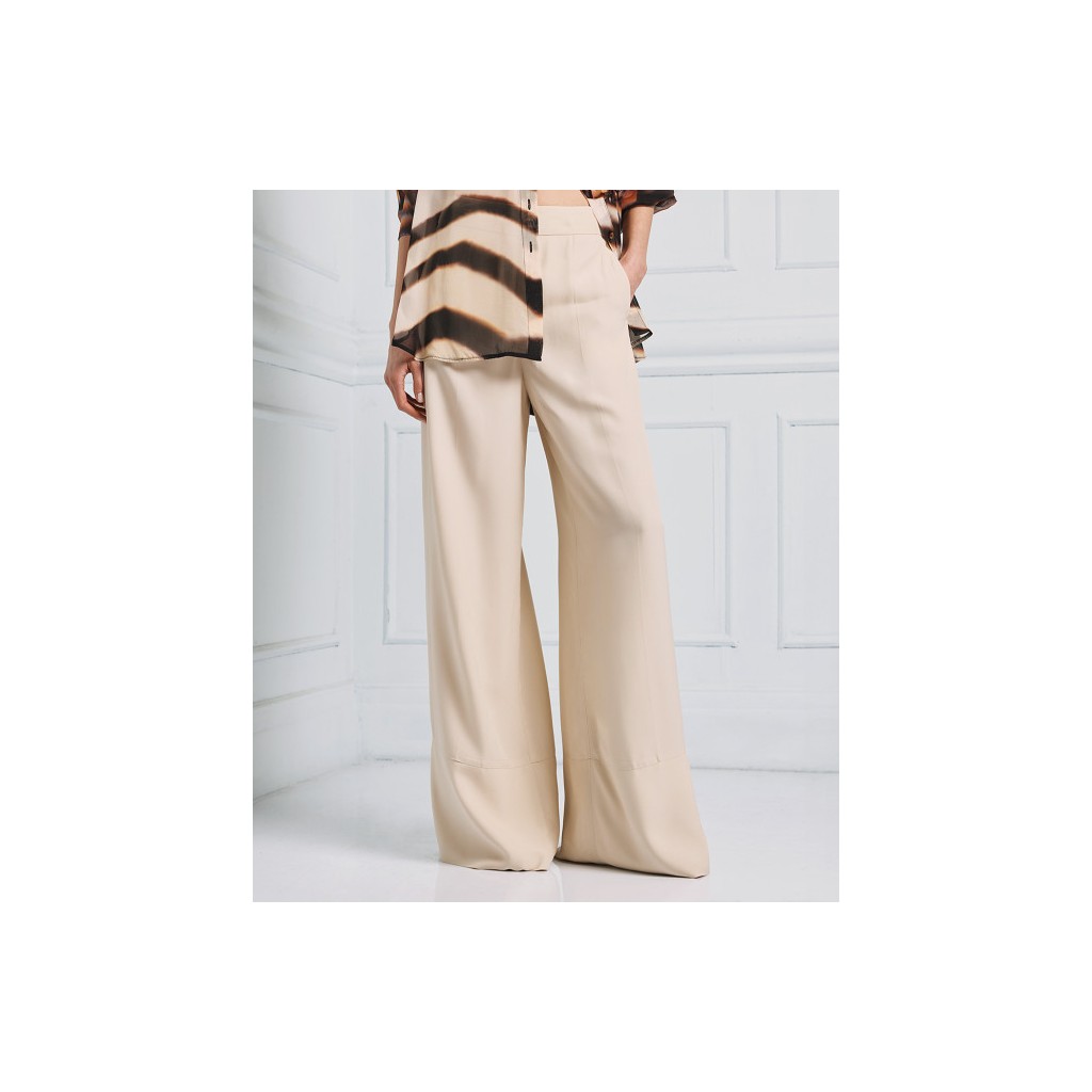Pantalones anchos de satén con costuras decorativas y bolsillos laterales. Son una prenda imprescindible que complementa cualquier look para cualquier ocasión.