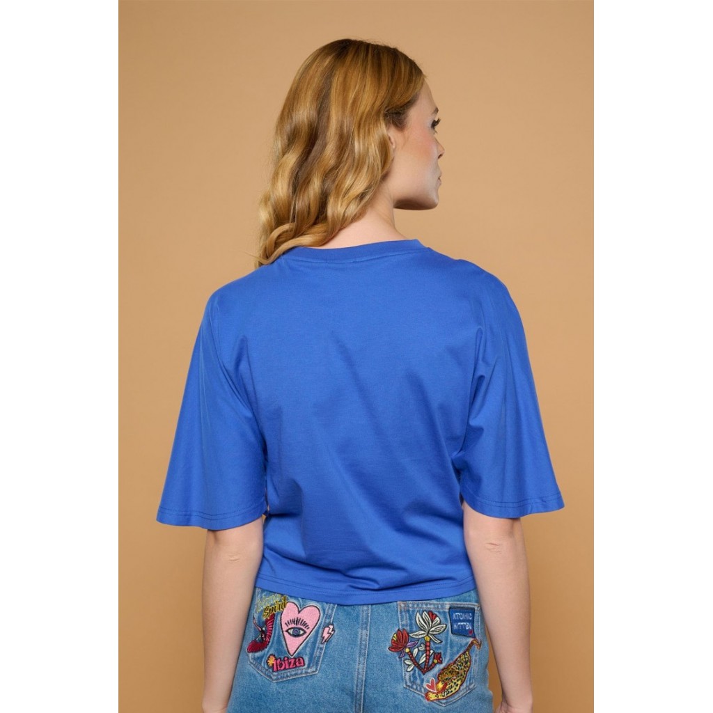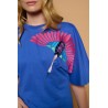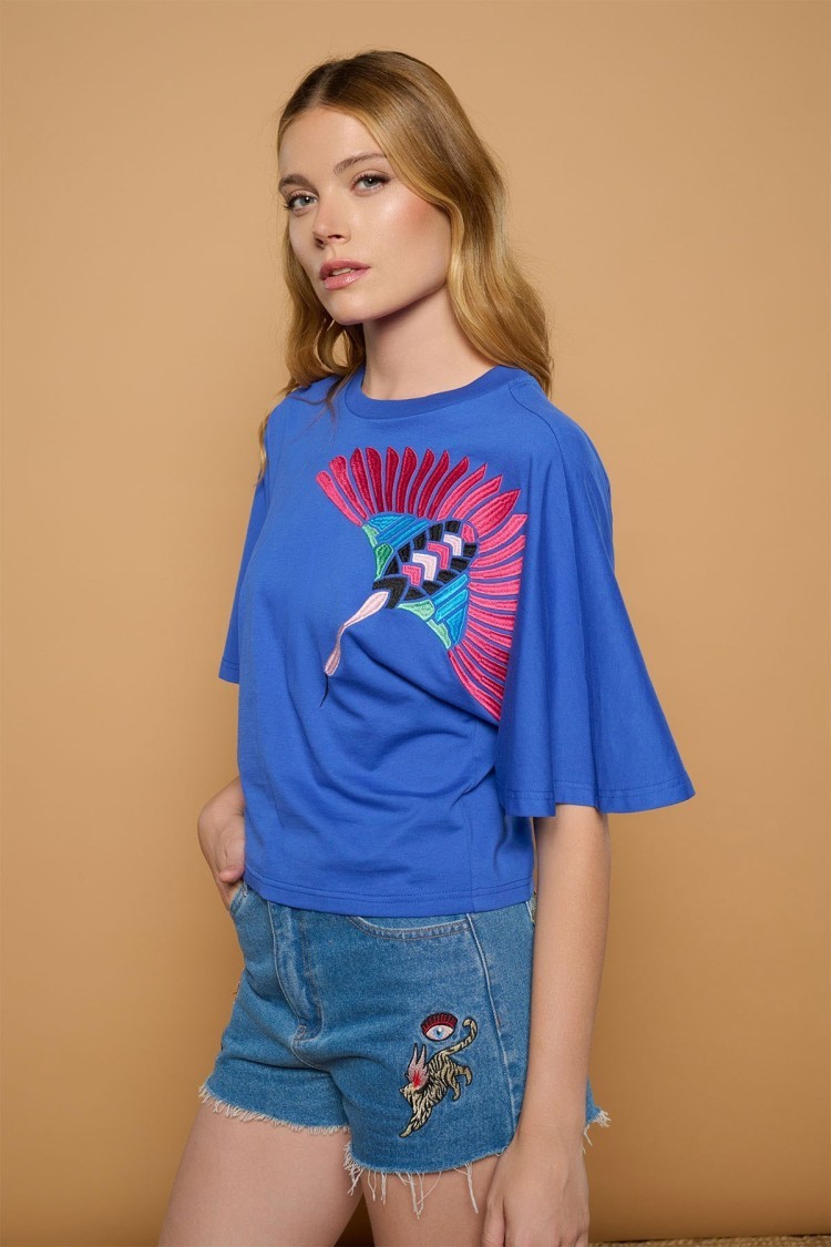 Camiseta de cuello redondo y manga corta acampanada. Detalle de bordado de ave en el lateral frontal con colores a contraste. Silueta fluida.