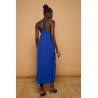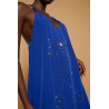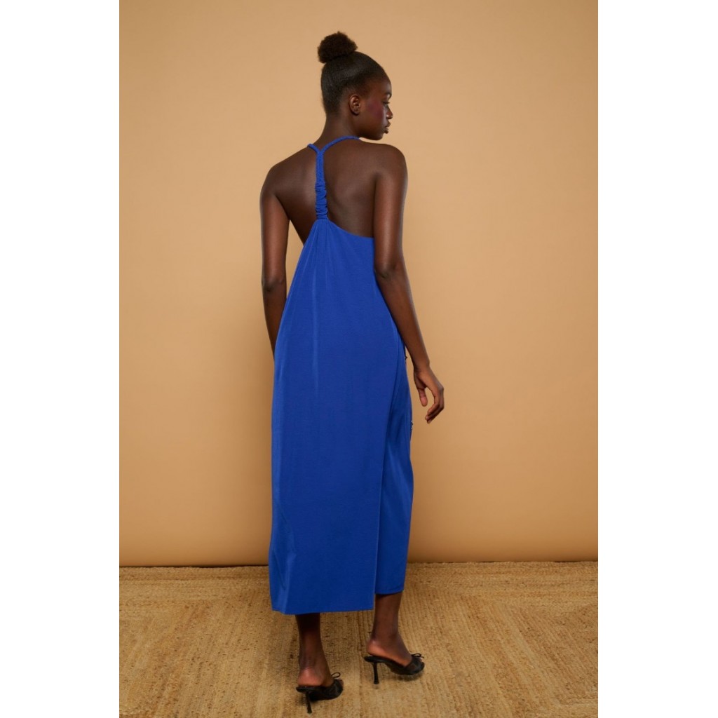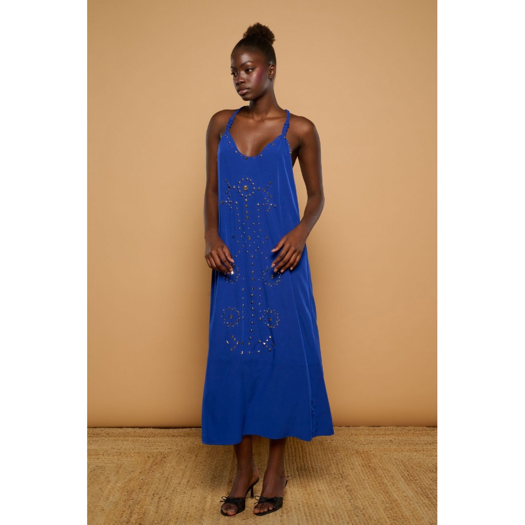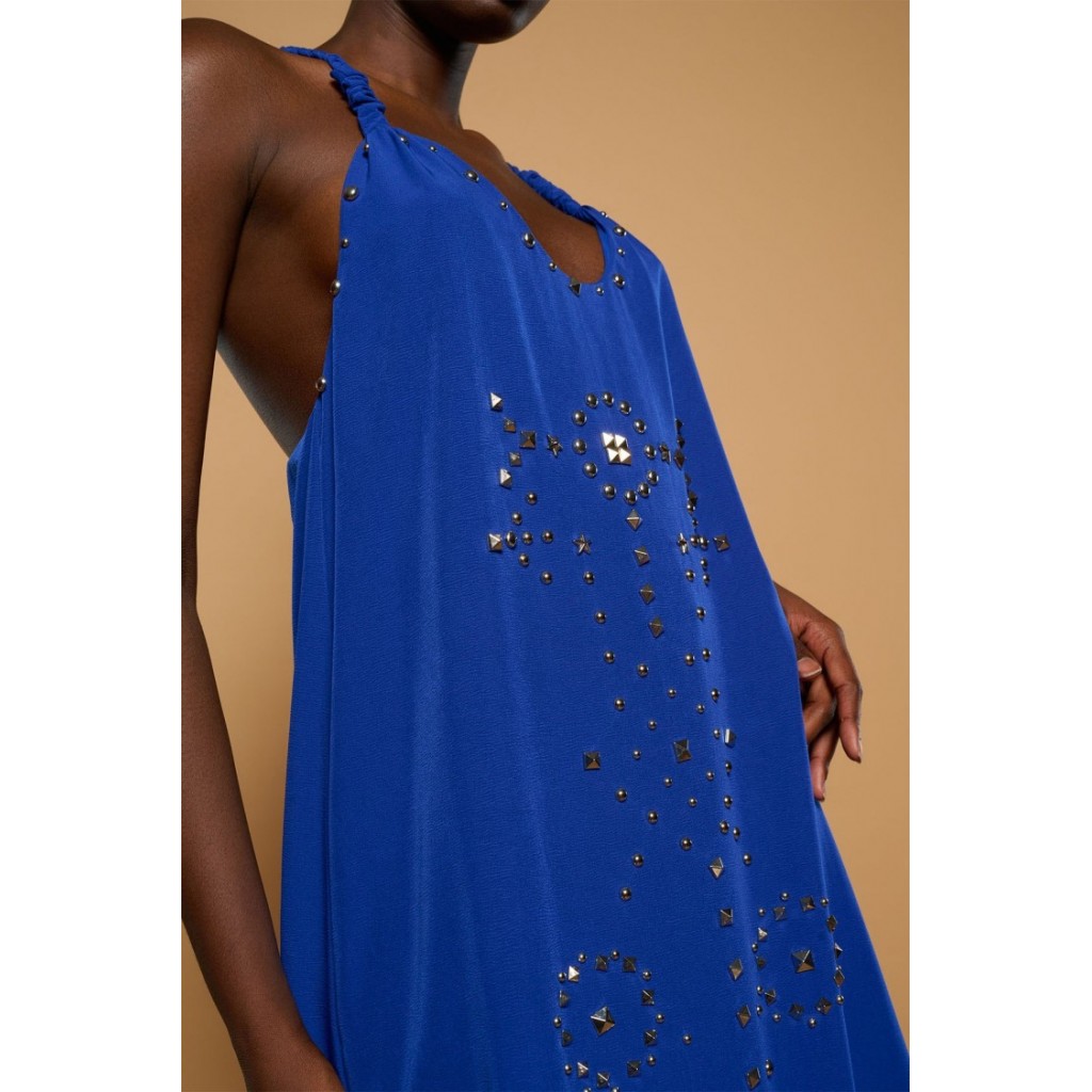 Vestido largo de escote en pico y tirantes finos. Detalle de aplicación de tachuelas metálicas en el escote y formando motivos decorativos en la parte frontal. Fit holgado.