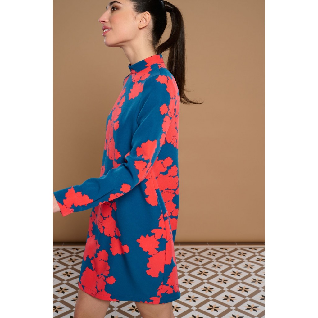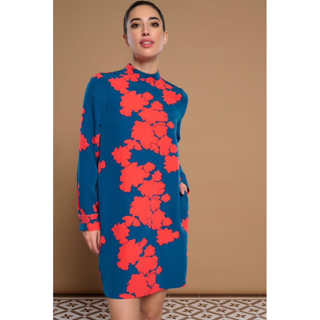 Vestido corto de cuello perkins y manga larga acabada en puño. Bolsillos laterales. Forro interior. Cierre con cremallera oculta en costura.