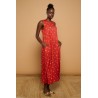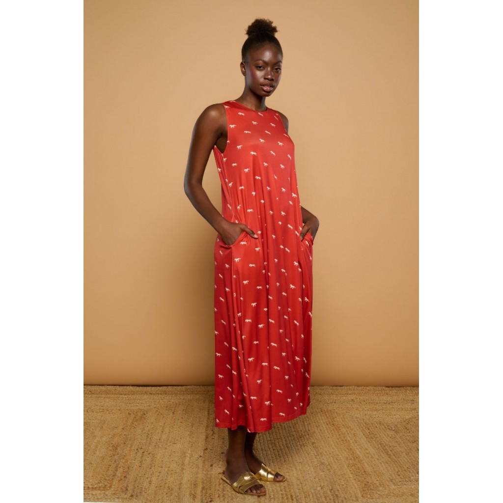 Maxi vestido de corte evasé en tejido elástico. Cuello redondo y manga sisa. Bolsillos laterales invisibles.