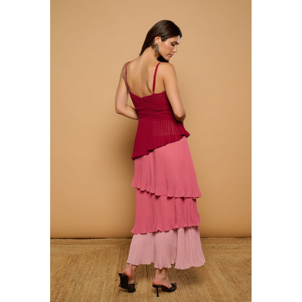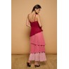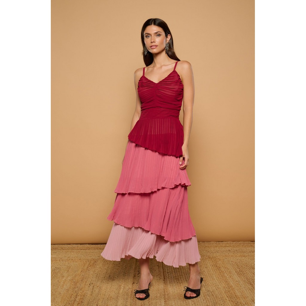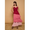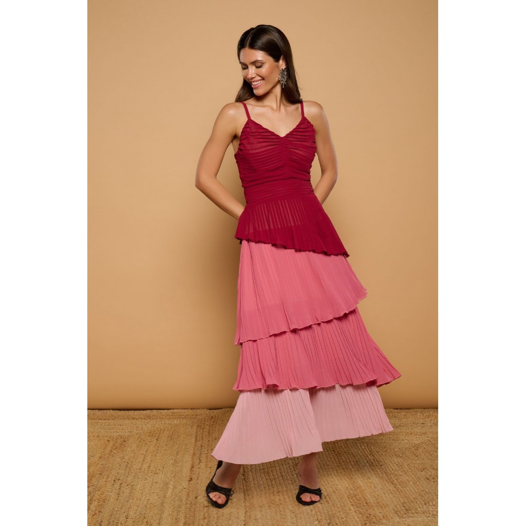 Vestido largo de tirantes. Tejido plisado. Escote en corazón. Falda de volantes en varios tonos. Cierre con cremallera trasera. Colección de eventos.