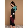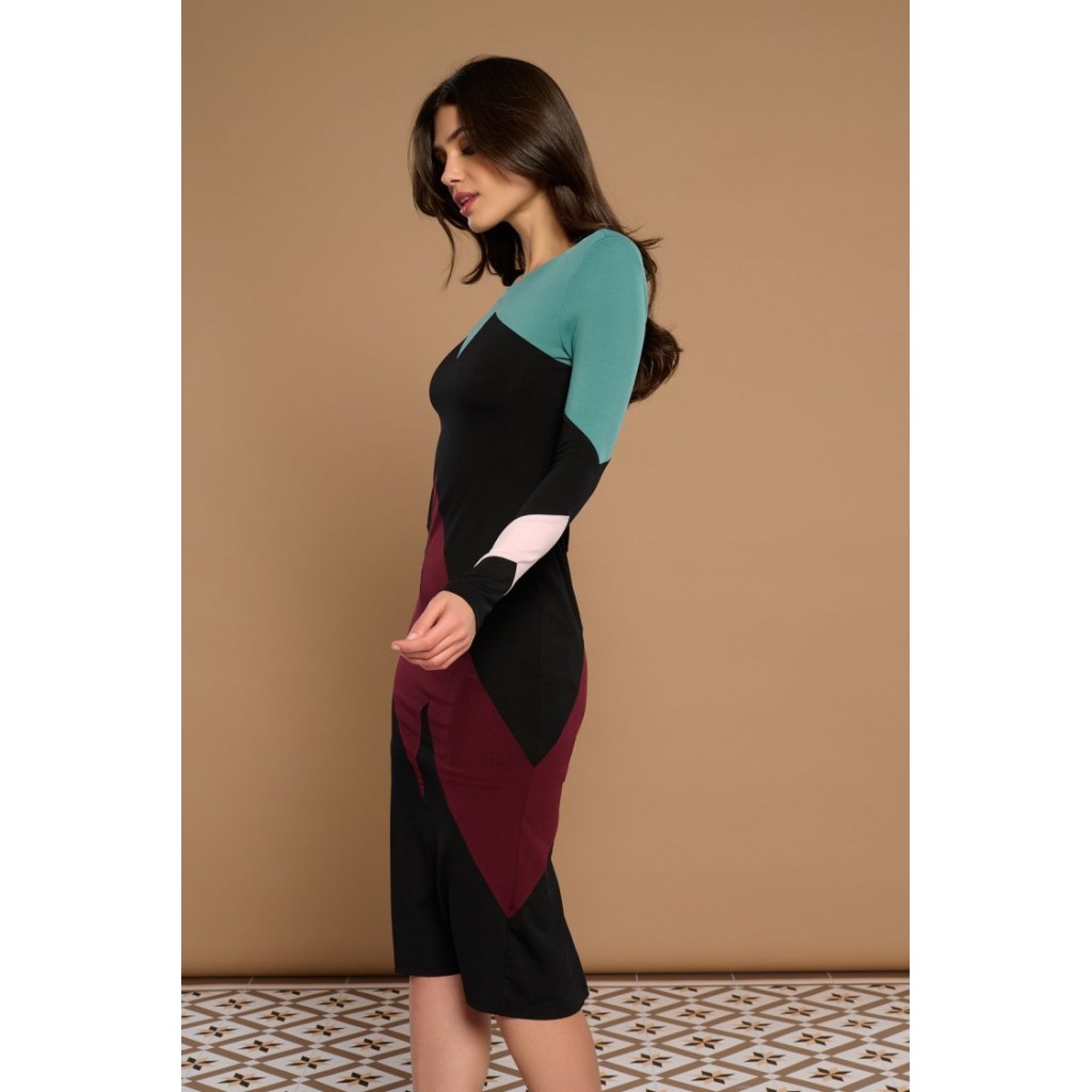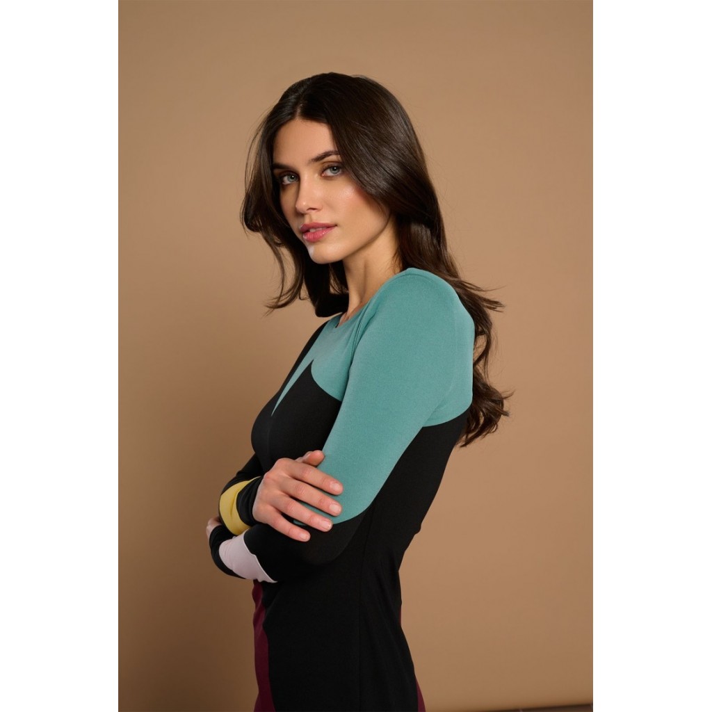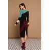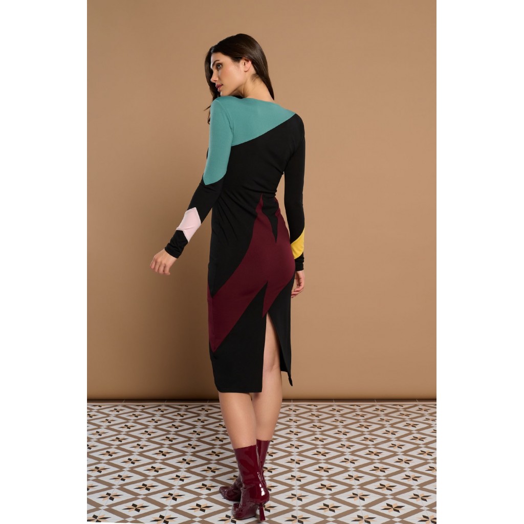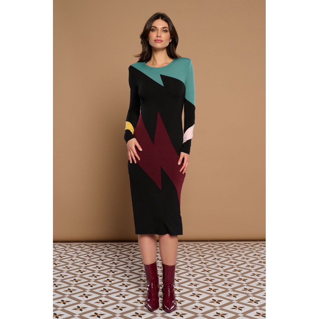 Vestido midi de cuello redondo y manga larga. Estampado de rayos color block. Tejido elástico. Forro interior elástico.