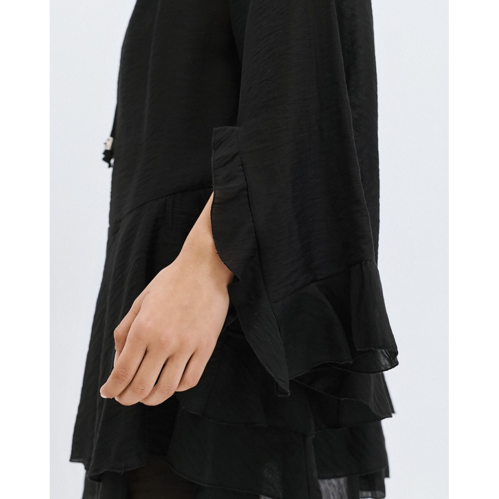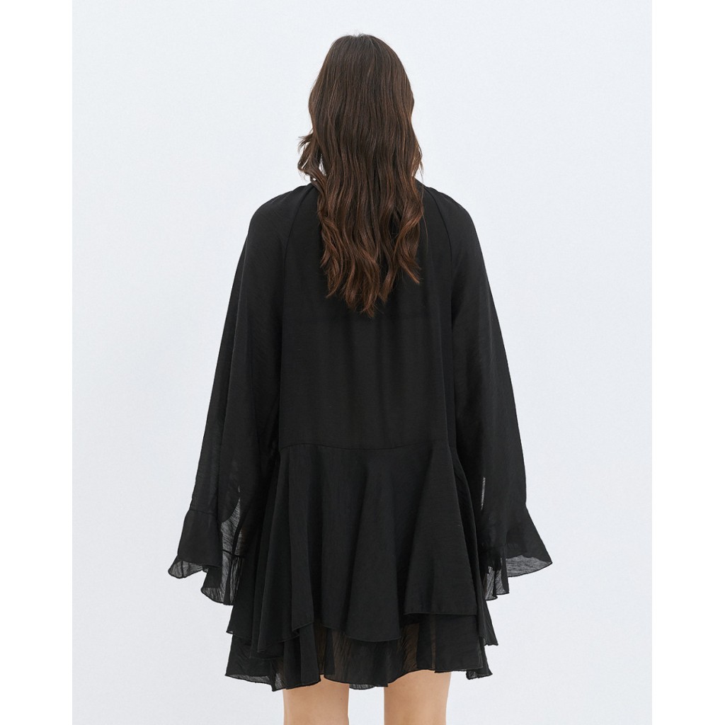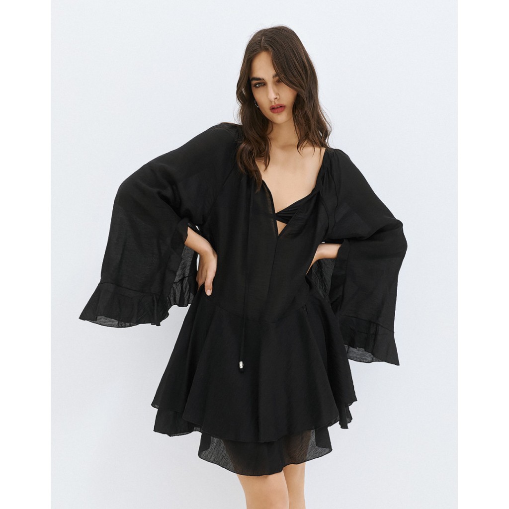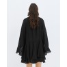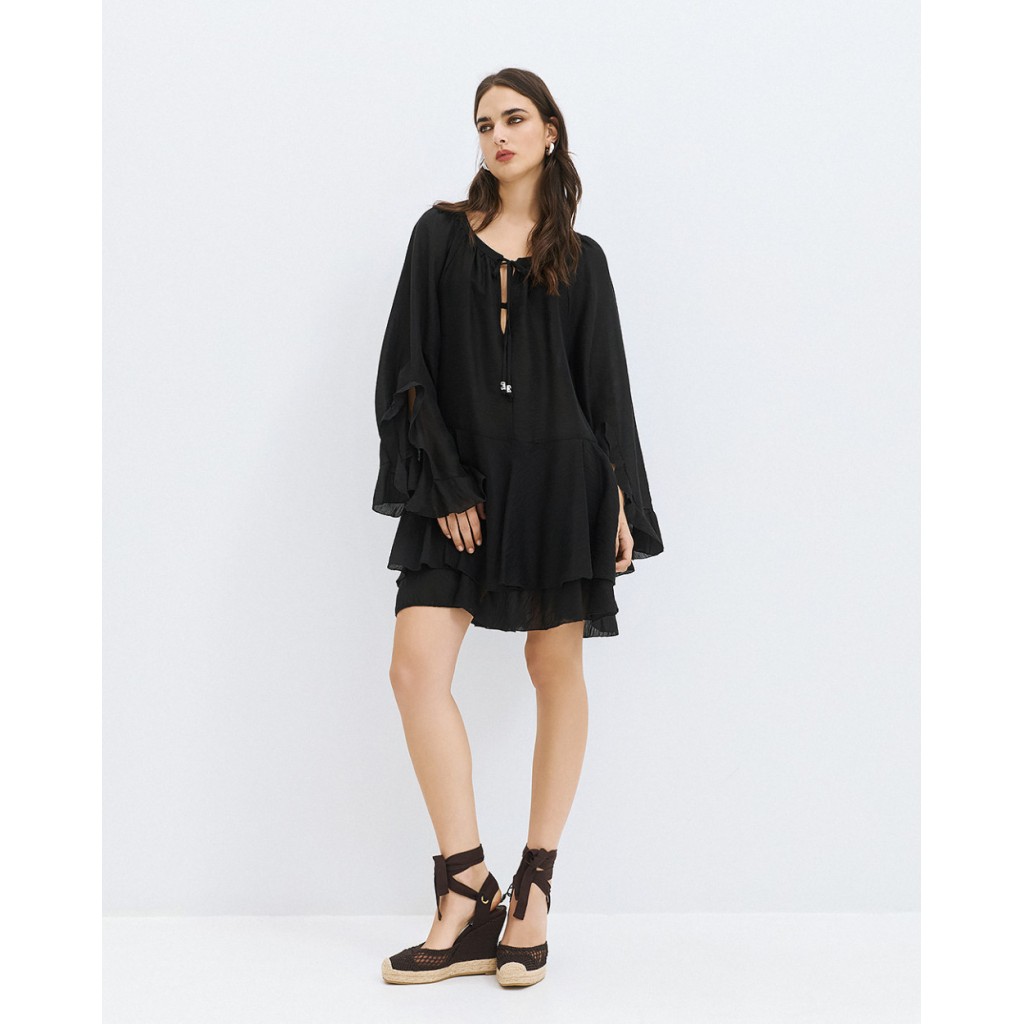 Minivestido con textura arrugada y escote en V con cordones ajustables. Presenta mangas largas y anchas con volantes y aberturas, y detalles de volantes en el bajo.