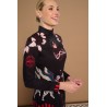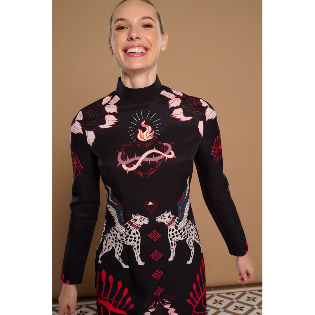 Vestido de cuello perkins y manga larga. Estampado místico. Forro interior. Cierre con cremallera oculta en costura.