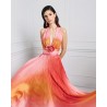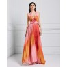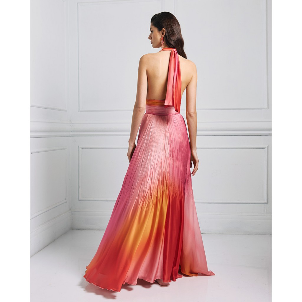 Vestido largo con un estampado degradado único y textura plisada. Incluye un broche floral y una llamativa espalda baja. Ideal para looks formales y elegantes.