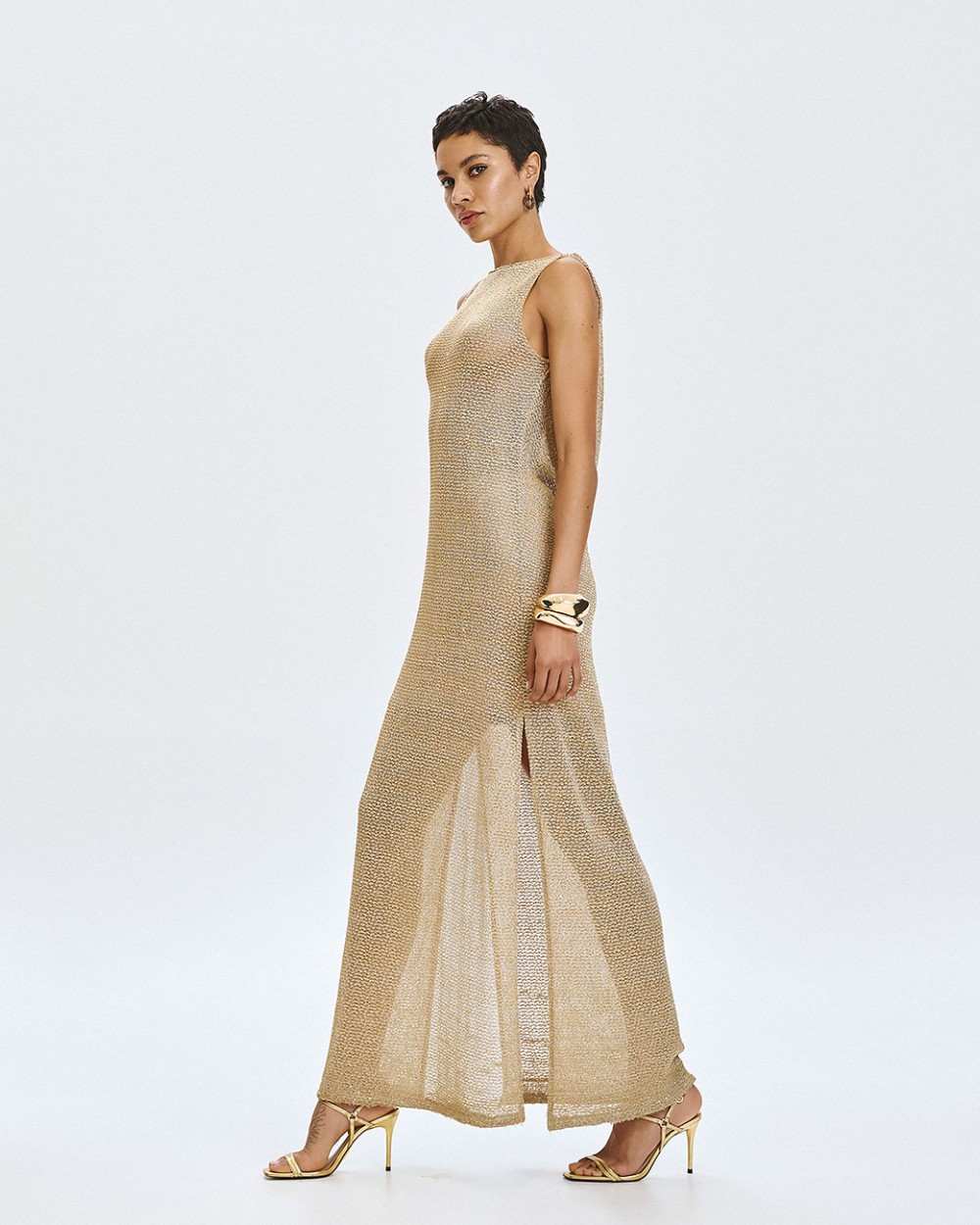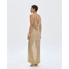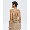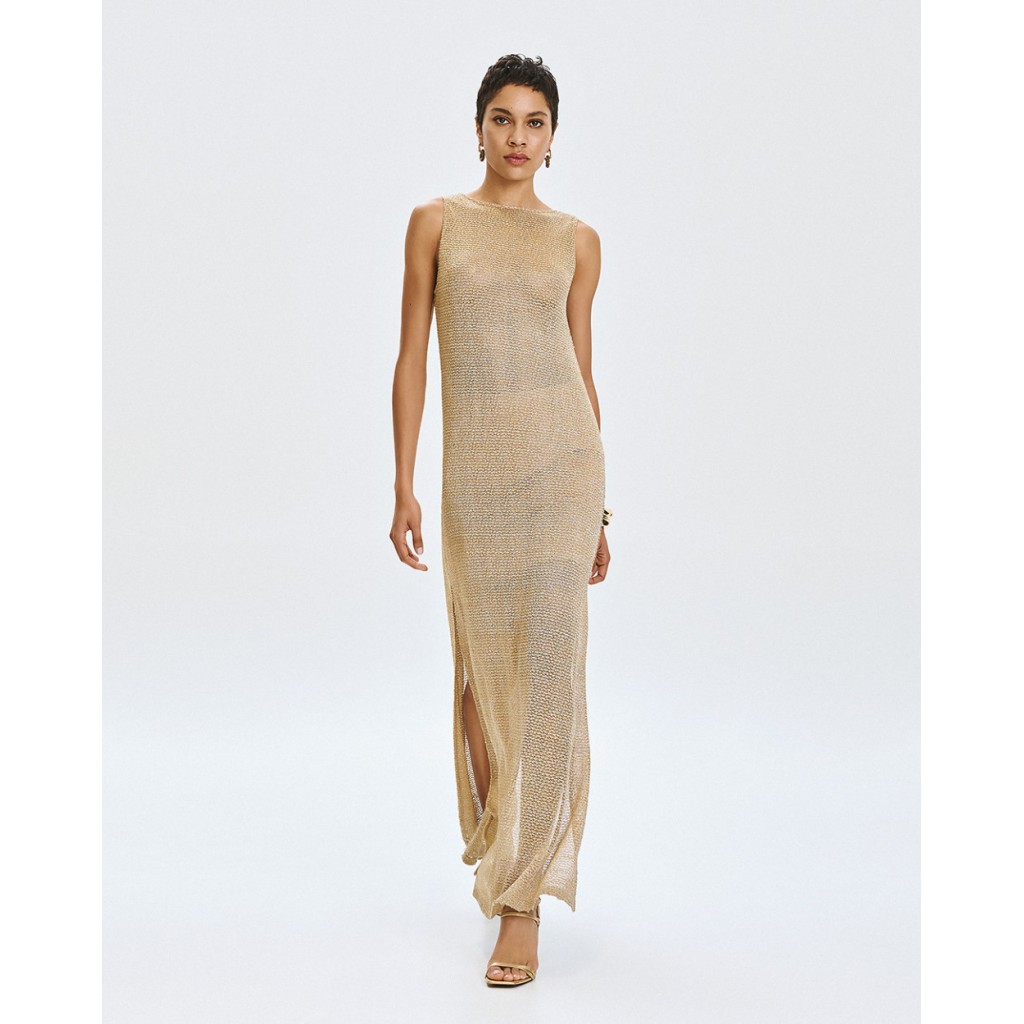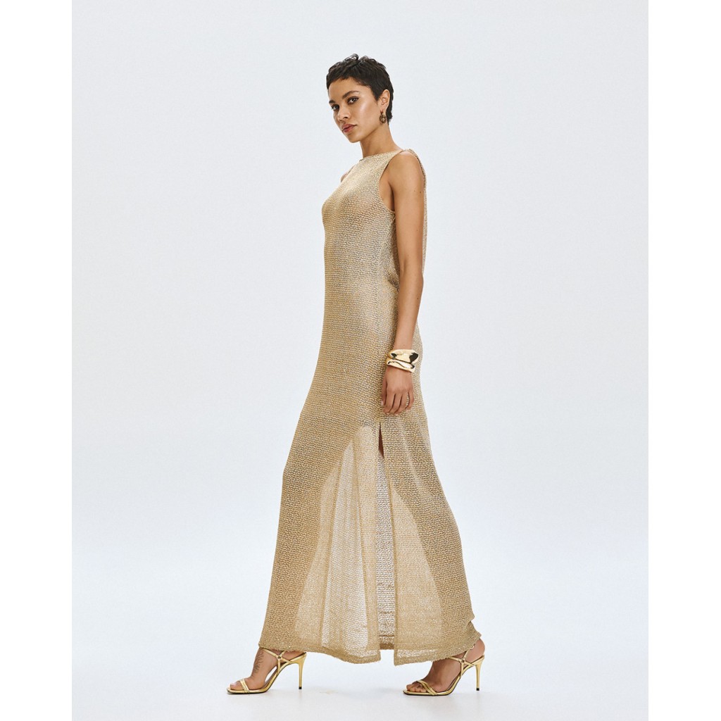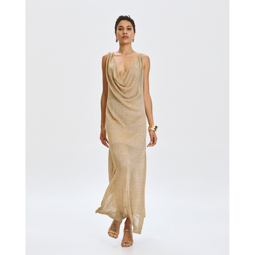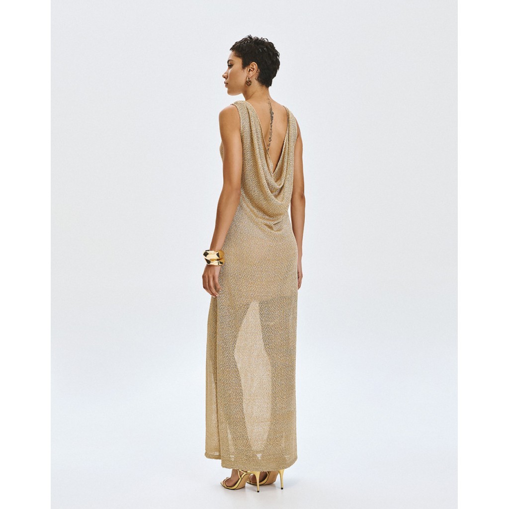 Vestido largo de punto sin mangas con detalles de lúrex y lentejuelas. Presenta escote drapeado, aberturas laterales en el bajo y una enagua desmontable.