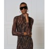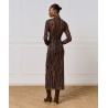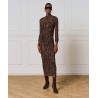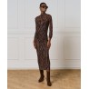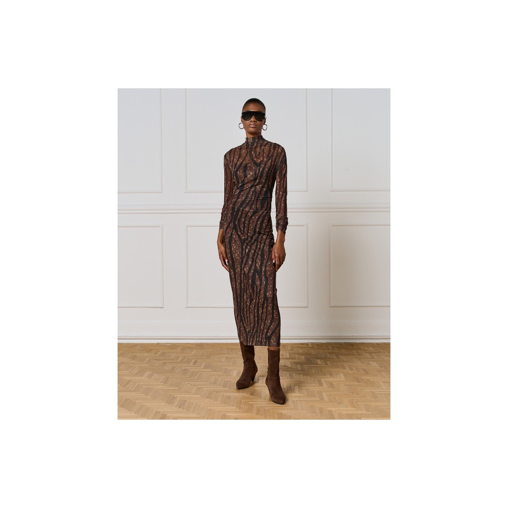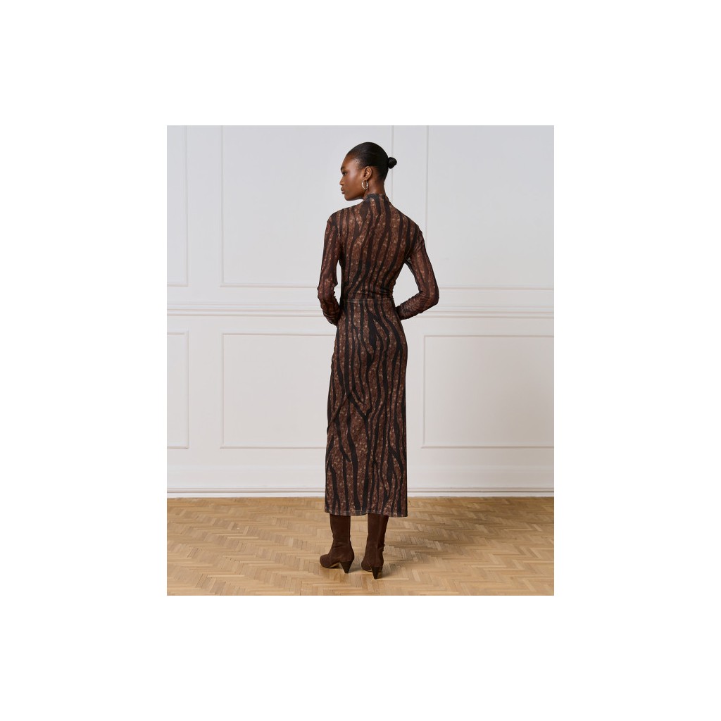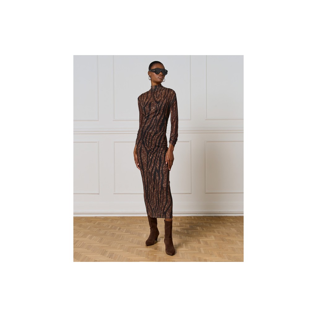 Vestido midi de tul estampado con forro interior y fruncido. Presenta mangas largas y cuello alto. Ideal para looks modernos y elegantes.